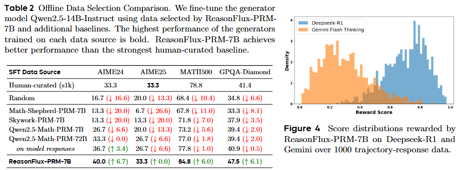 我们观察到,在下游离线数据筛选 + SFT 的设置下,ReasonFlux-PRM-7B 的表现超越了高质量的人工精选 s1k 数据集。我们进一步可视化了由 Deepseek-R1 和 Gemini 生成的 1,000 组推理轨迹-响应对的得分分布。清晰分离的分布表明,ReasonFlux-PRM-7B 能够有效区分不同模型生成响应的质量,为高质量数据筛选提供了稳健可靠的奖励信号。