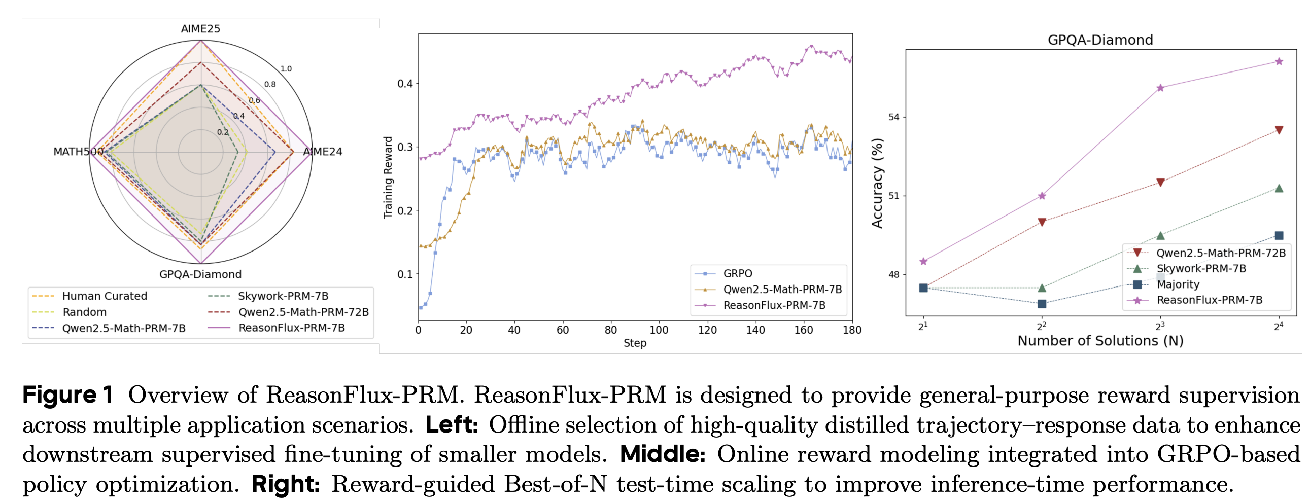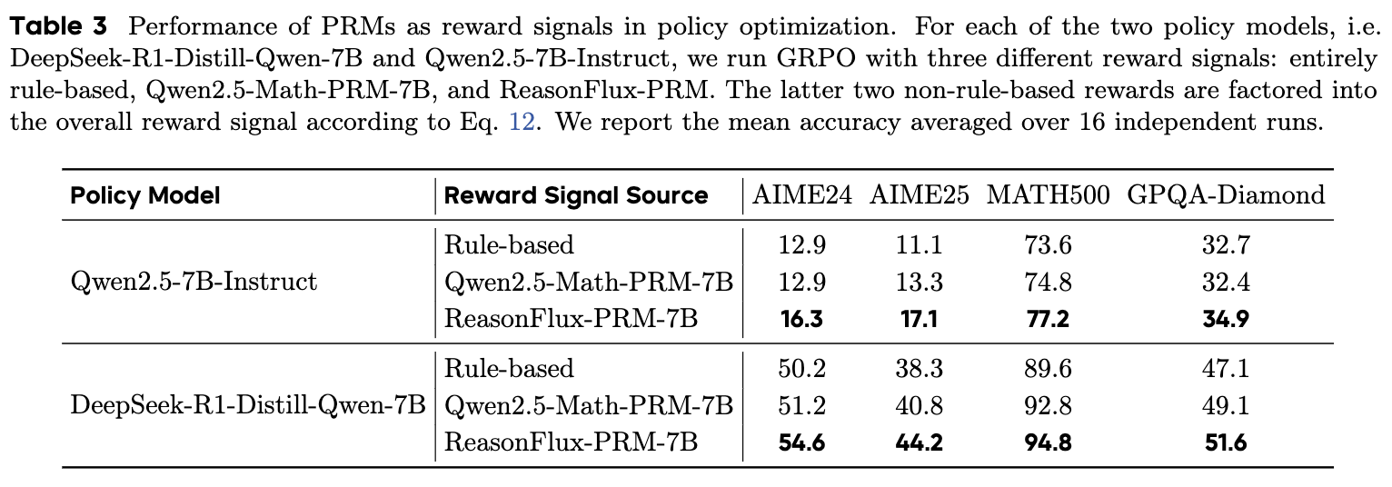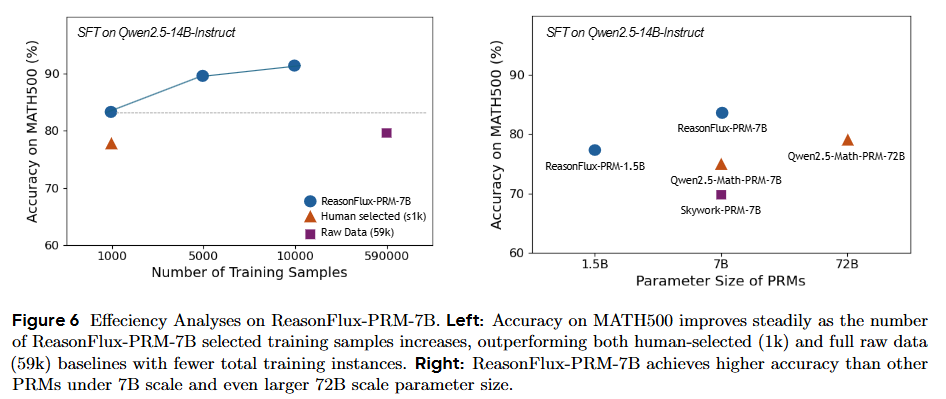 | ReasonFlux-PRM | 7B | • 轨迹感知评分 • 在线/离线监督 • 密集的过程奖励 |