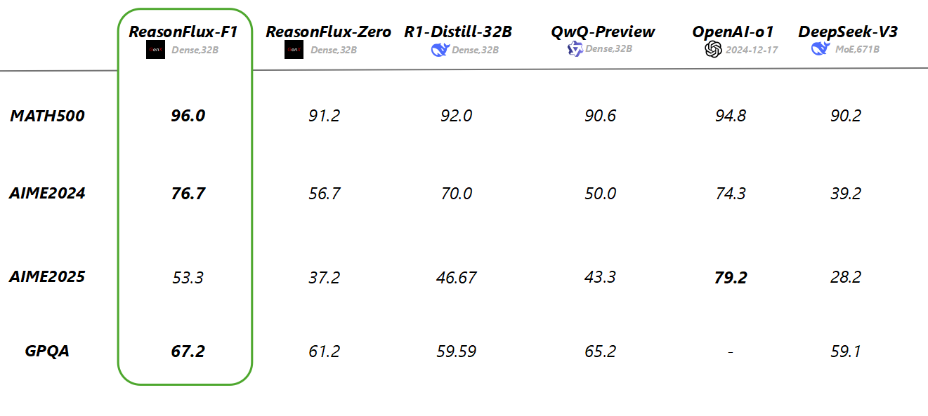 | ReasonFlux-Zero | 32B | • 分层推理 • 模板库 • 基础模型 |