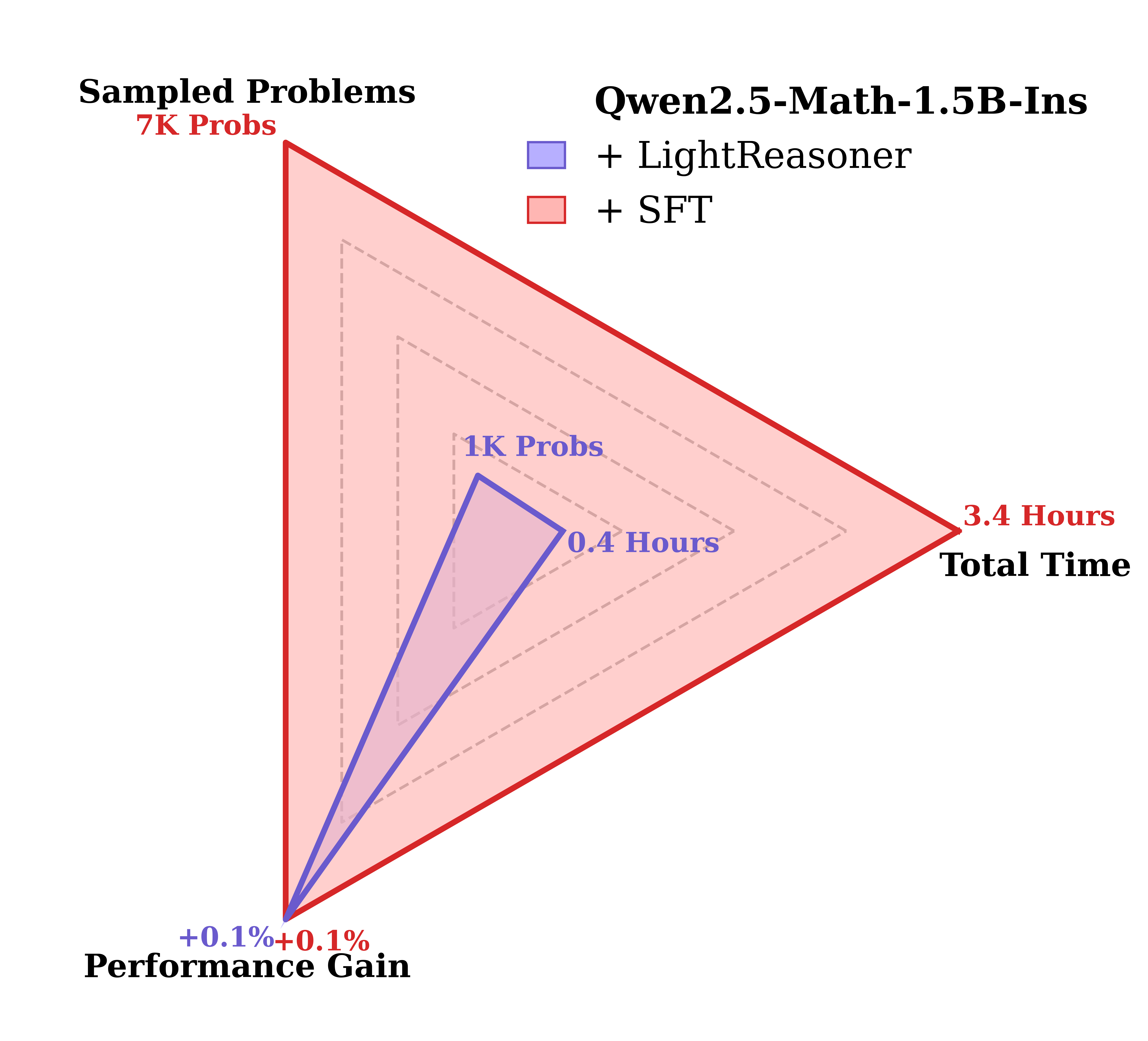 LRsamples— 预先收集的LightReasoner训练样本,可直接用于微调。该数据集无需完整的采样流程即可进行模型训练,从而简化复现工作并加速下游研究流程。 - [2025/10/14] 🚀 新发布:LightReasoner增强模型现已在🤗 Hugging Face Hub 上线。这些即用型模型采用我们高效的推理增强方法进行微调,可立即部署和实验。