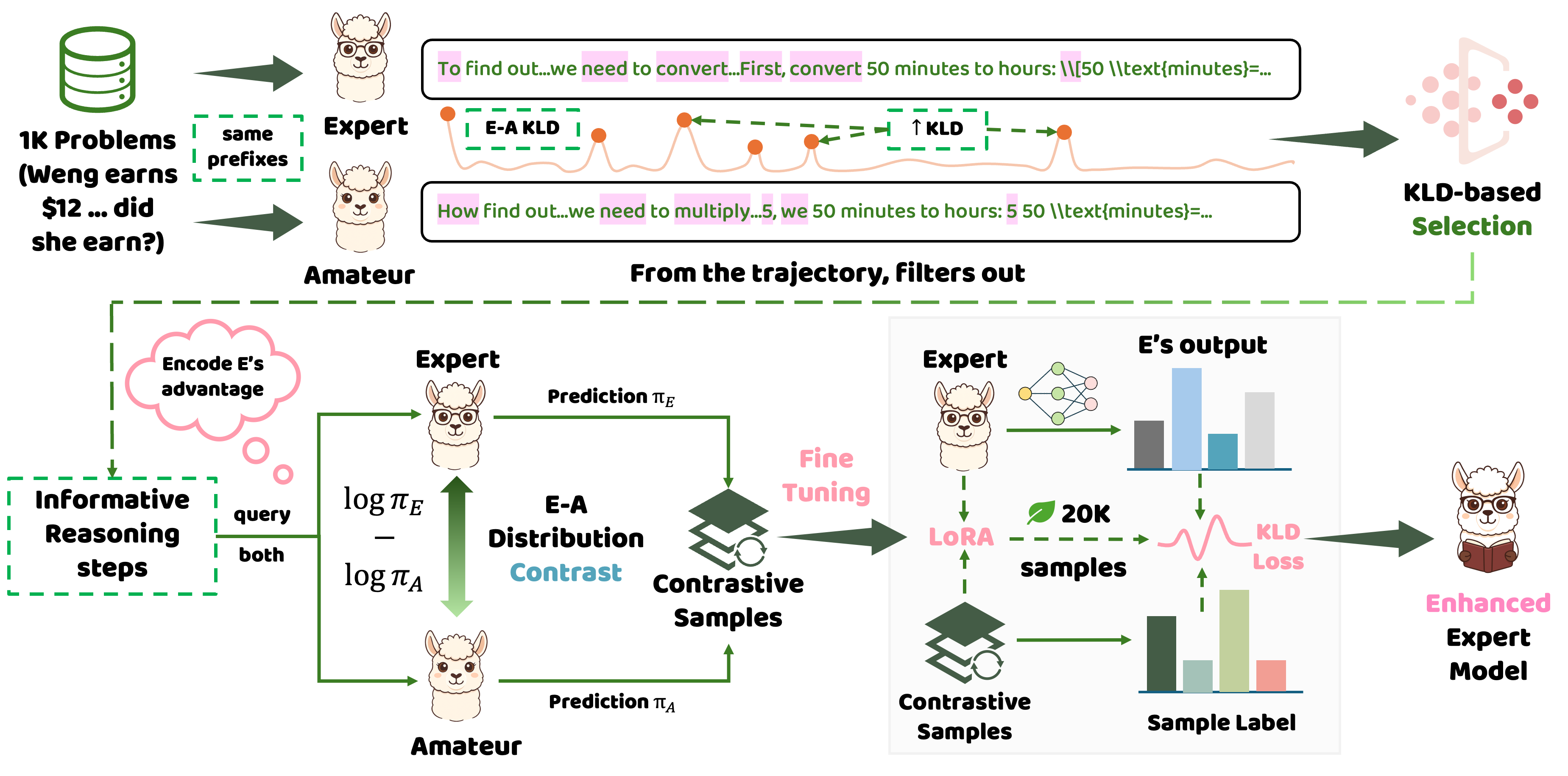 图2:LightReasoner 框架概览。 (1) 采样阶段:专家模型和业余模型分别生成分布 πE 和 πA。通过保留 DKL(πE ∥ πA) > β 的步骤,进行信息性步长选择;同时,对比监督机制会构建软标签 vC,以捕捉专家模型的优势。 (2) 微调阶段:通过最小化专家模型输出与 vC 之间的 KL 散度,进一步提升专家模型性能。