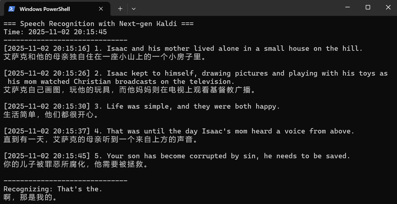 注意:翻译不是实时的,翻译模型只会在每句话识别完成后再调用。