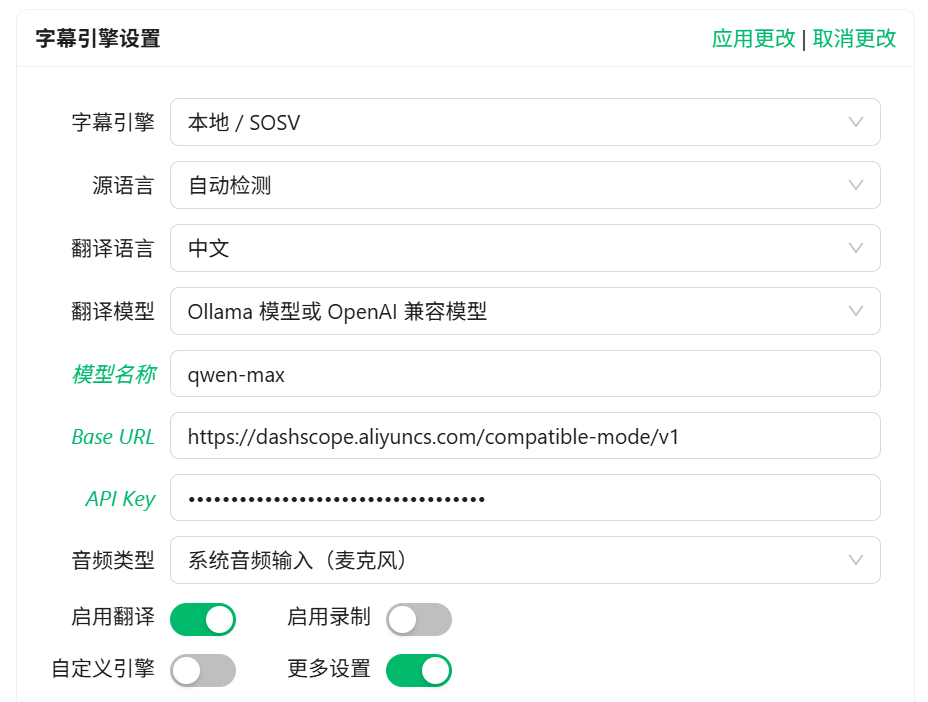 如果你选择的不是 Gummy 模型,你还需要配置自己的翻译模型。