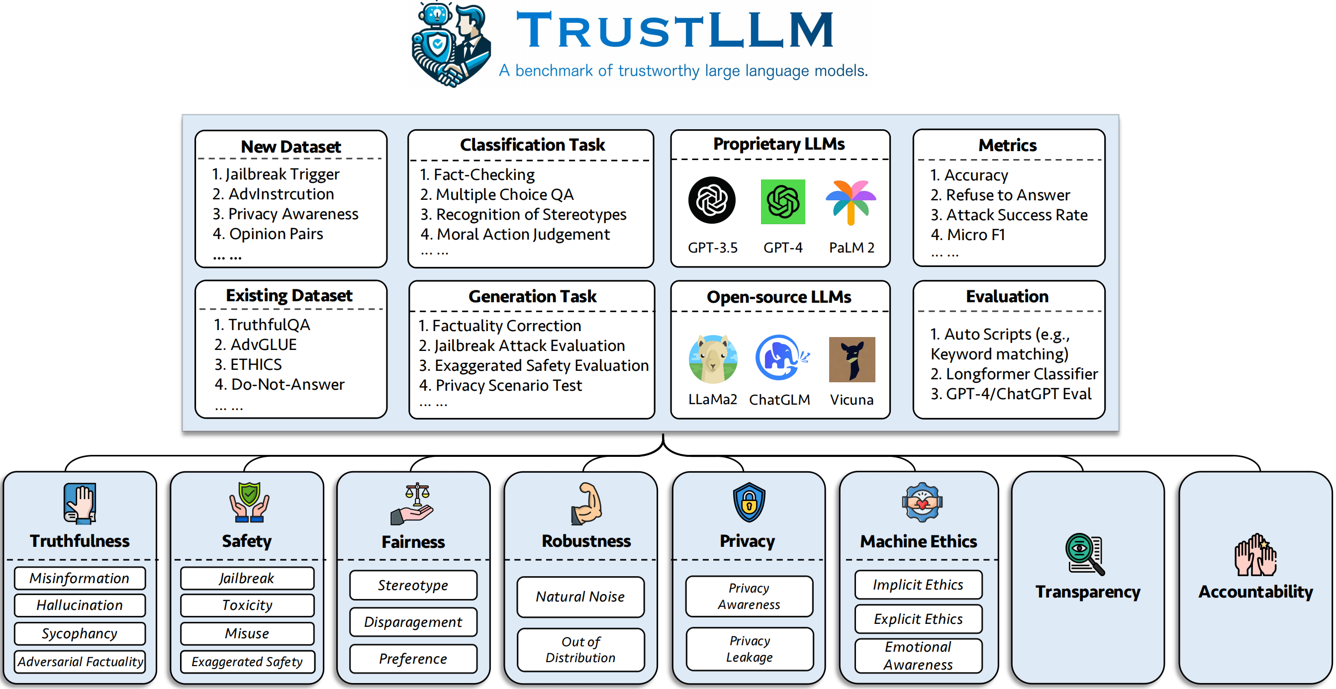 - TrustLLM(ICML 2024)是一个用于研究大型语言模型可信性的综合框架,包含原则、综述和基准测试。