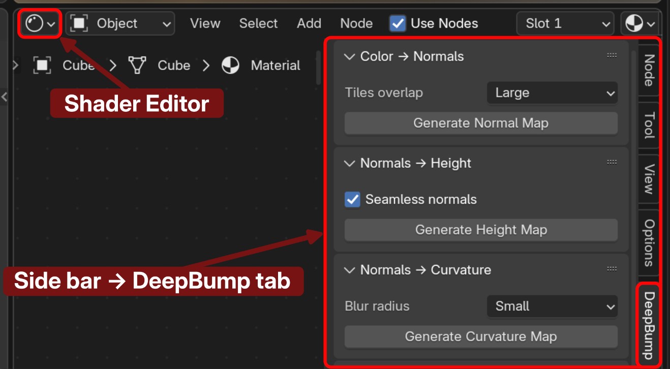 在 着色器编辑器 中,在侧边栏的 DeepBump 选项卡 下: