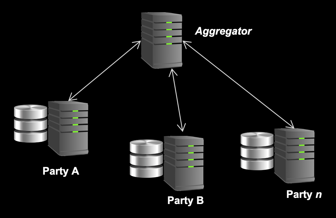 一组参与方各自拥有数据,并在本地训练模型。这些参与方使用联邦学习协议与聚合器交换更新信息。聚合器会融合(聚合)来自不同参与方的结果,并将整合后的结果返回给各参与方。这一过程可以反复进行,直到满足终止条件为止。IBM 联邦学习支持对这些训练场景的配置。