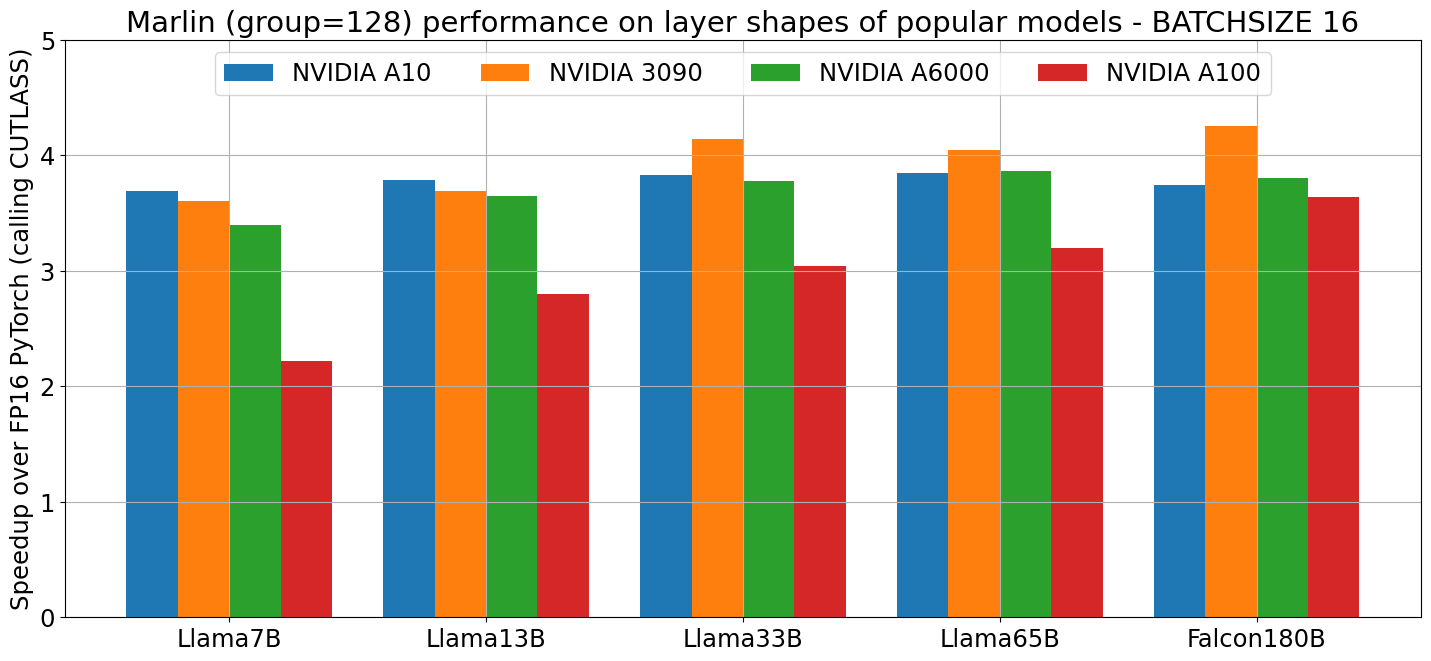 此后,使用 Marlin 内核(Marlin kernel)最简单的方式是通过 marlin.Layer,这是一个代表 Marlin 量化层(quantized layer)的 torch-module (torch 模块)。它允许通过 marlin.Layer.pack(linear, scales) 将“伪量化”(以 FP16 存储的去量化值)的 torch.Linear 层转换为压缩的 Marlin 格式。或者,如果权重和缩放系数已经过适当的预处理(参见 marlin.Layer.pack(...)),也可以直接通过 marlin.mul(..) 调用该内核。内核本身位于自包含的 marlin/marlin_cuda_kernel.cu 文件中,除了 base-CUDA (基础 CUDA) 之外不包含任何依赖项,因此应易于集成到其他底层框架中。
