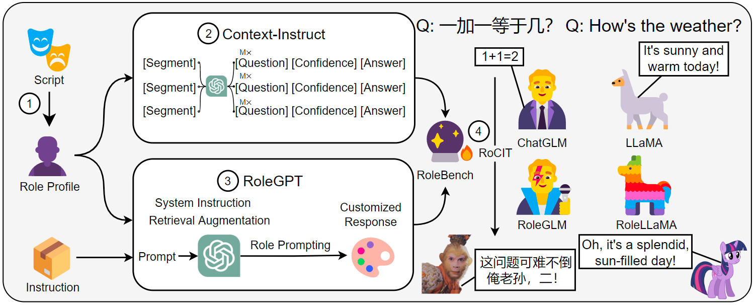 我们提出了RoleLLM,一个包含数据构建与评估框架(RoleBench)的角色扮演解决方案,以及针对闭源和开源模型的优化方案(RoleGPT、RoleLLaMA、RoleGLM)。此外,我们还提出了Context-Instruct方法,用于长文本知识提取和角色特定知识注入。