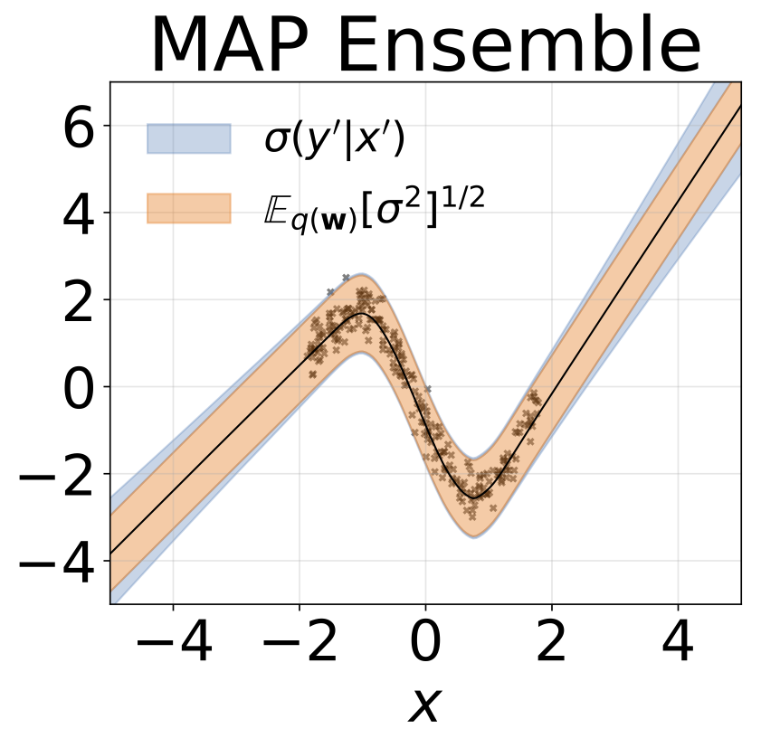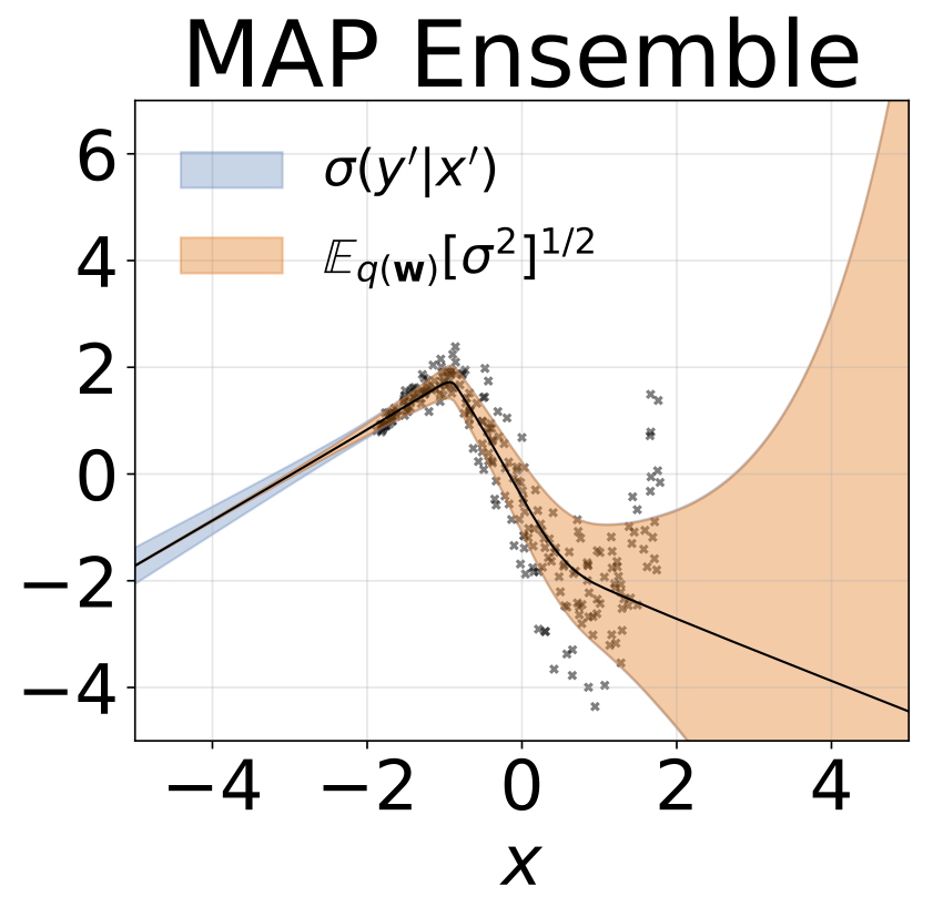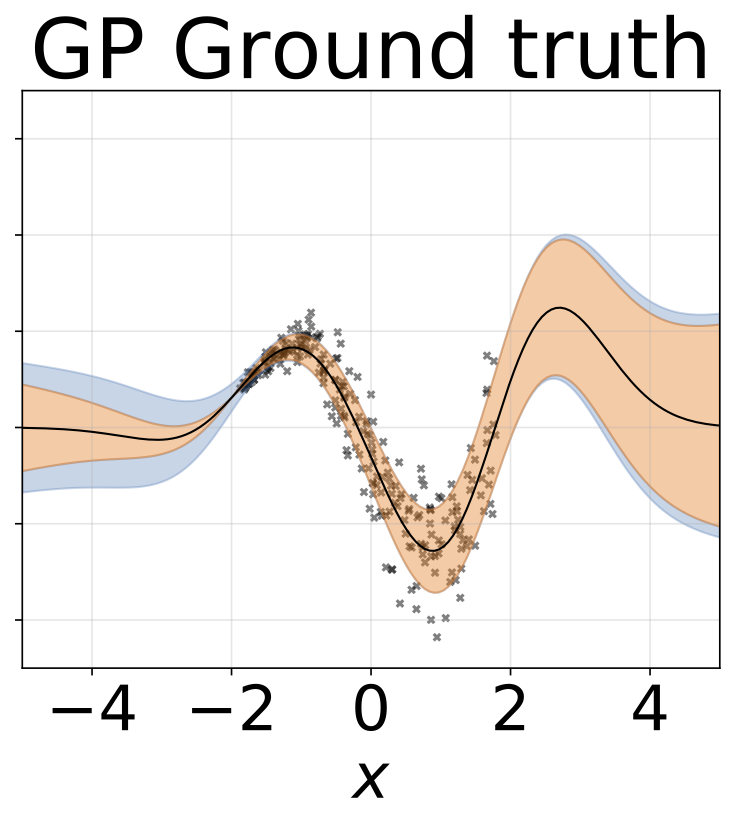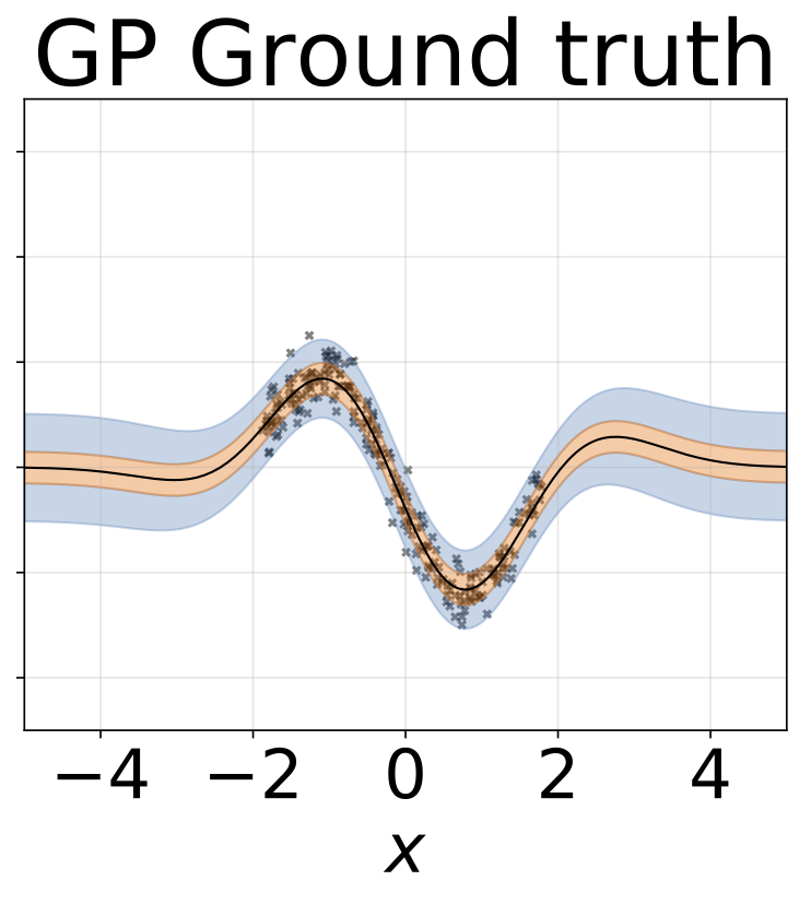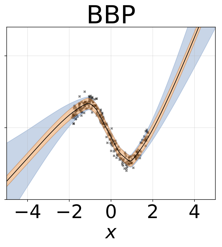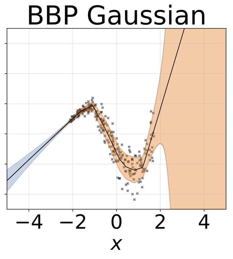 玩具异方差回归任务。数据由具有RBF核(l = 1, σn = 0.3 · |x + 2|)的GP生成。我们使用一个双头网络,包含200个ReLU单元,分别预测回归均值μ(x)和对数标准差log σ(x)。