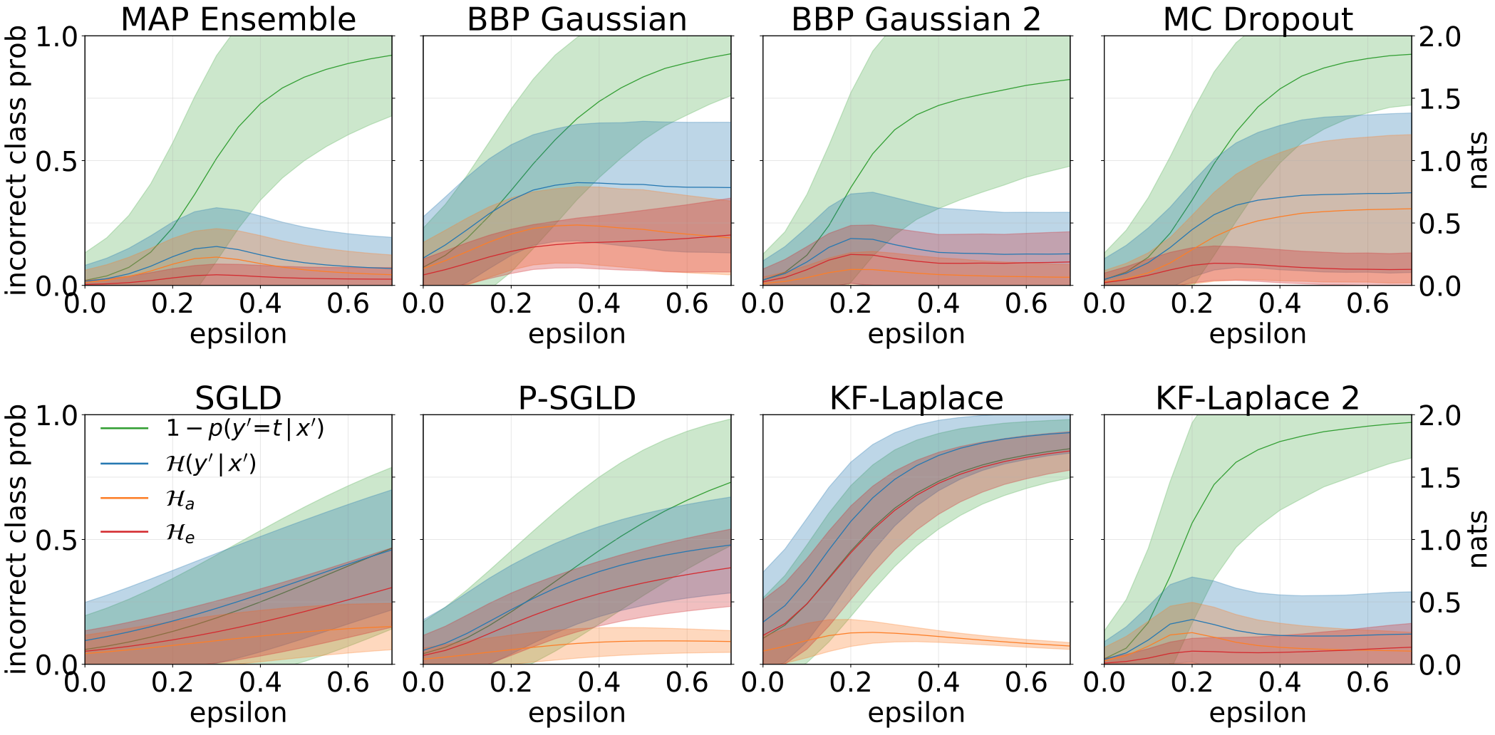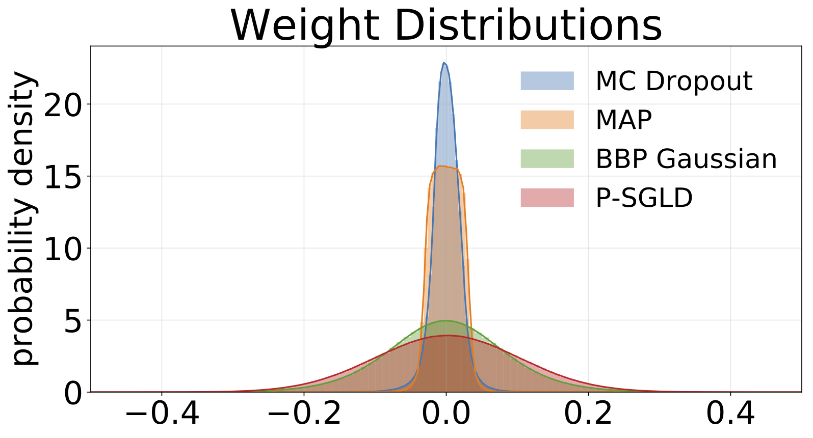 | MNIST测试 | MAP | MAP 集成 | BBP 高斯 | BBP GMM | BBP 拉普拉斯 | BBP 局部重参数化 | MC Dropout | SGLD | pSGLD | |:--------------: |:-------: |:-------------------: |:--------------: |:---------: |:-------------: |:-------------------: |:----------: |:-------: |:-------: | | Log Like | -572.9 | -496.54 | -1100.29 | -1008.28 | -892.85 | -1086.43 | -435.458 | -828.29 | -661.25 | | Error % | 1.58 | 1.53 | 2.60 | 2.38 | 2.28 | 2.61 | 1.37 | 1.76 | 1.76 |