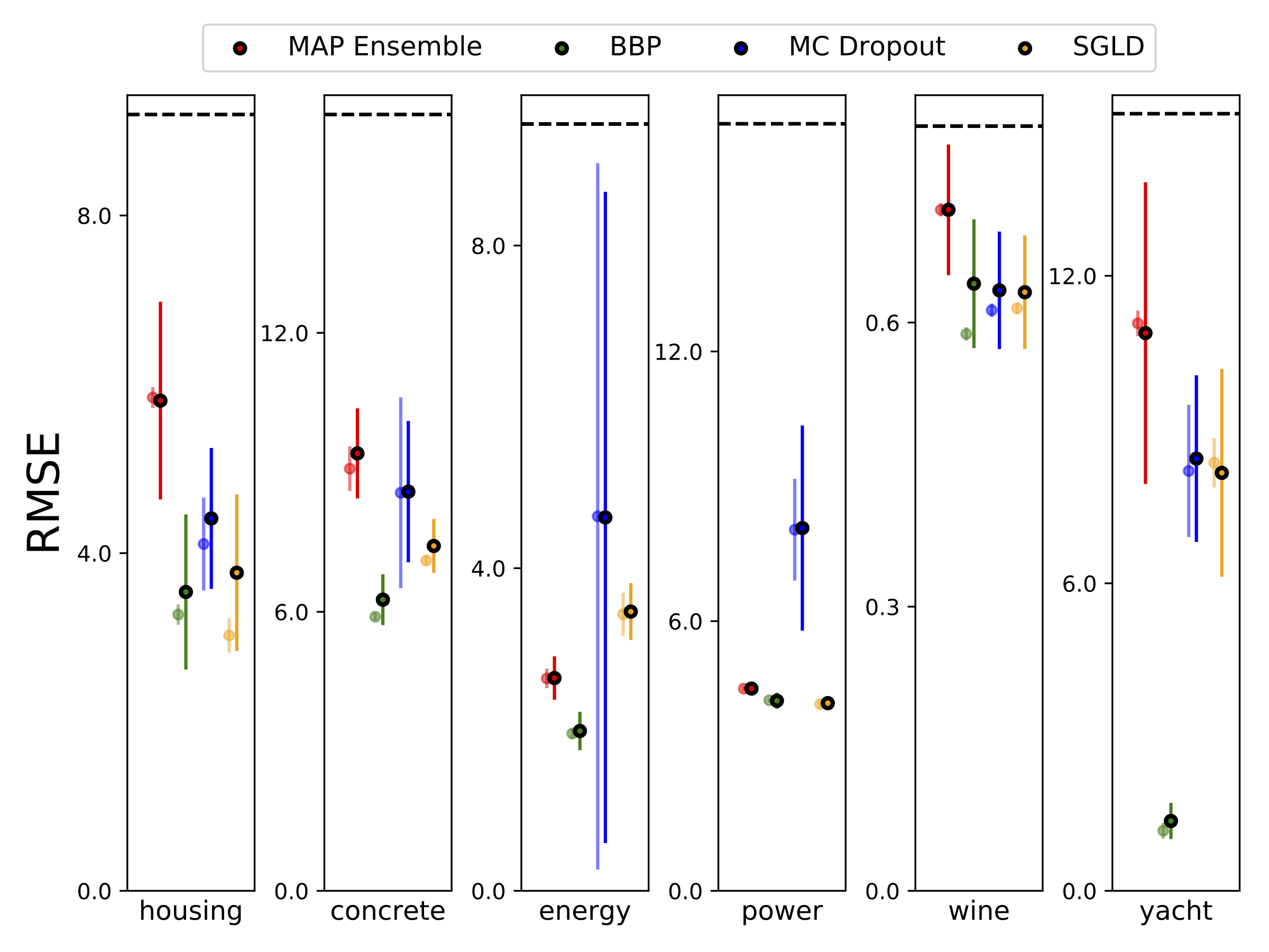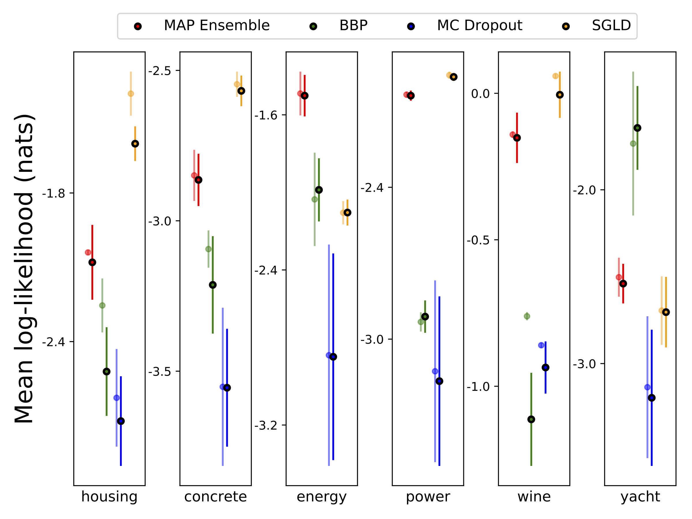 我们在六个UCI数据集上进行了异方差回归(包括housing、concrete、energy efficiency、power plant、red wine和yacht),采用10折交叉验证。所有实验都包含在异方差笔记本中。需要注意的是,结果高度依赖于超参数的选择。下方图表展示了训练集(半透明颜色)和测试集(实心颜色)上的对数似然和RMSE。圆圈和误差线分别对应10折交叉验证的均值和标准差。
