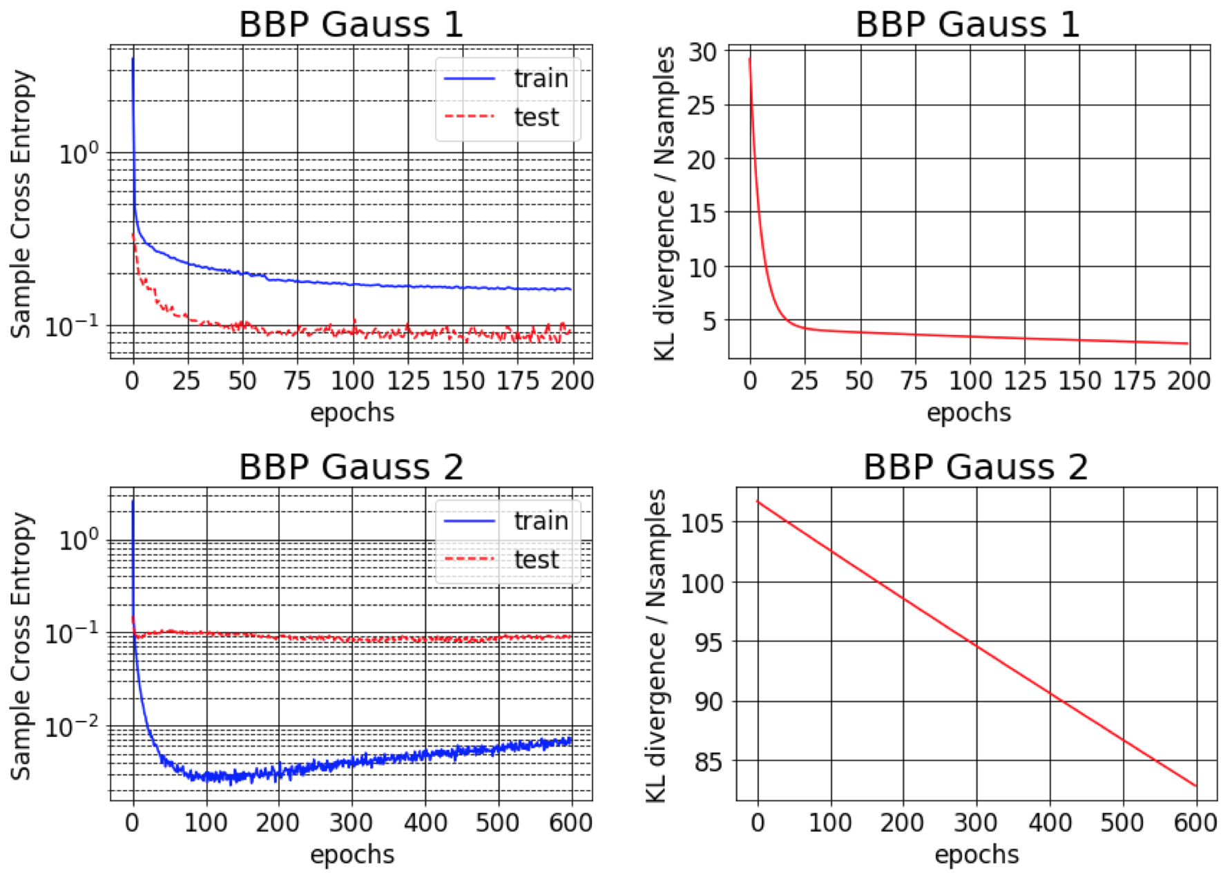 关于Bayes By Backprop的原始论文(https://arxiv.org/abs/1505.05424)报告称,在MNIST数据集上误差约为1%。我们发现,只有当近似后验方差初始化为非常小(BBP Gauss 2)时,才能达到这一效果。在这种情况下,权重分布接近狄拉克δ函数,虽然预测性能良好,但不确定性估计较差。然而,当将方差初始化为与先验一致(BBP Gauss 1)时,便得到了上述结果。这两种超参数配置方案的训练曲线如下所示: