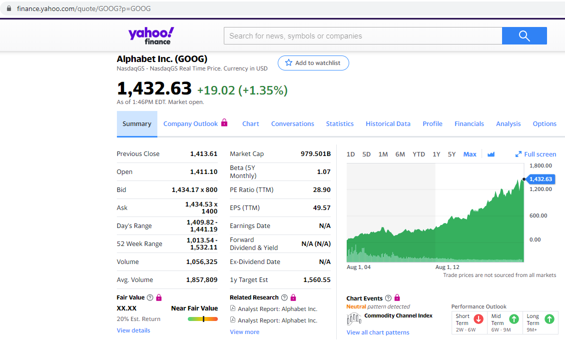 在本项目中,我们将使用“GOOG”这一股票代码,它代表一家知名的科技公司。以下是Yahoo Finance页面上该股票代码的示例截图: