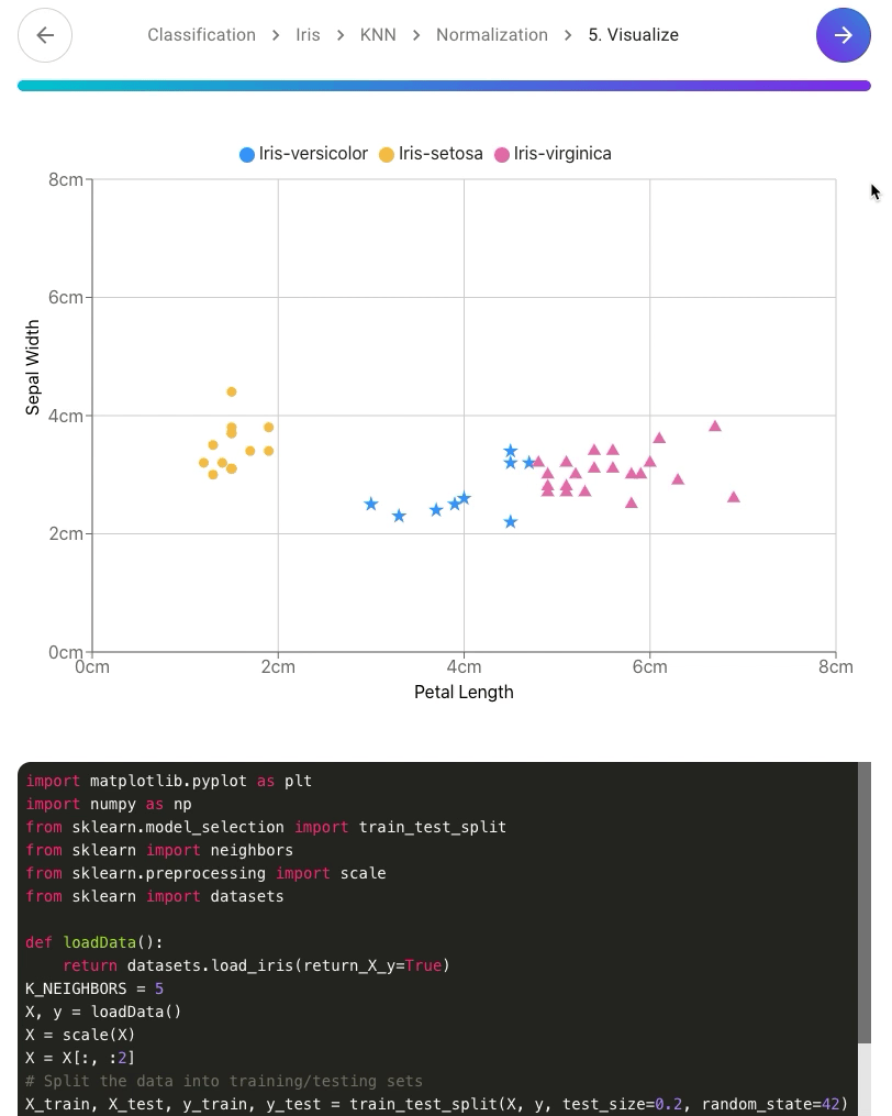 说出:“我想根据花瓣长度对花卉种类进行分类”,看看 Otto 如何自动填充您的工作流组件,并为流行的 Iris 数据集生成最近邻分类的可视化结果。