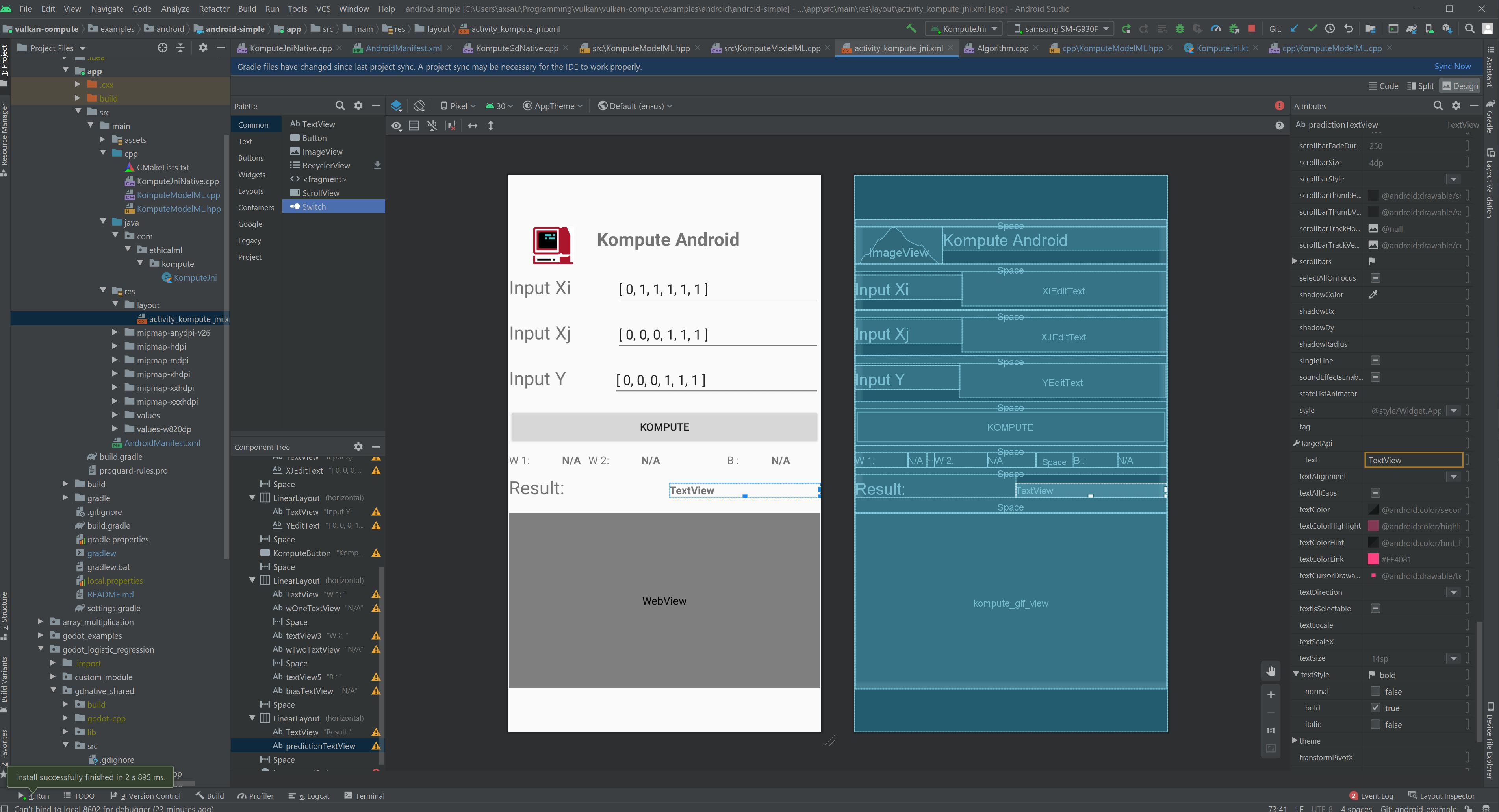 Kompute 已针对移动环境进行了优化。构建系统支持在 Android 环境中动态加载 Vulkan 共享库,并提供适用于 CPP 头文件的 Android NDK 封装。