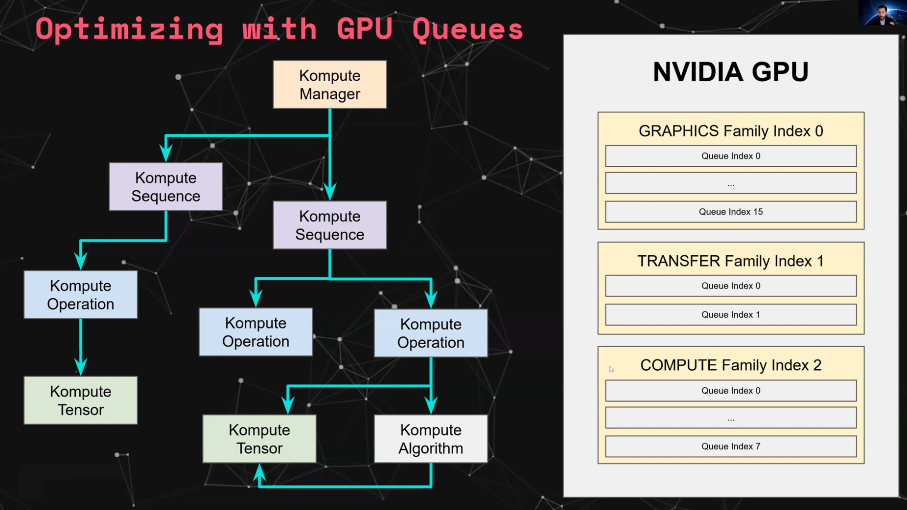 Kompute 通过 vk::Fences 提供了以异步方式运行操作的灵活性。此外,Kompute 还支持显式分配队列,从而允许跨队列族并行执行操作。