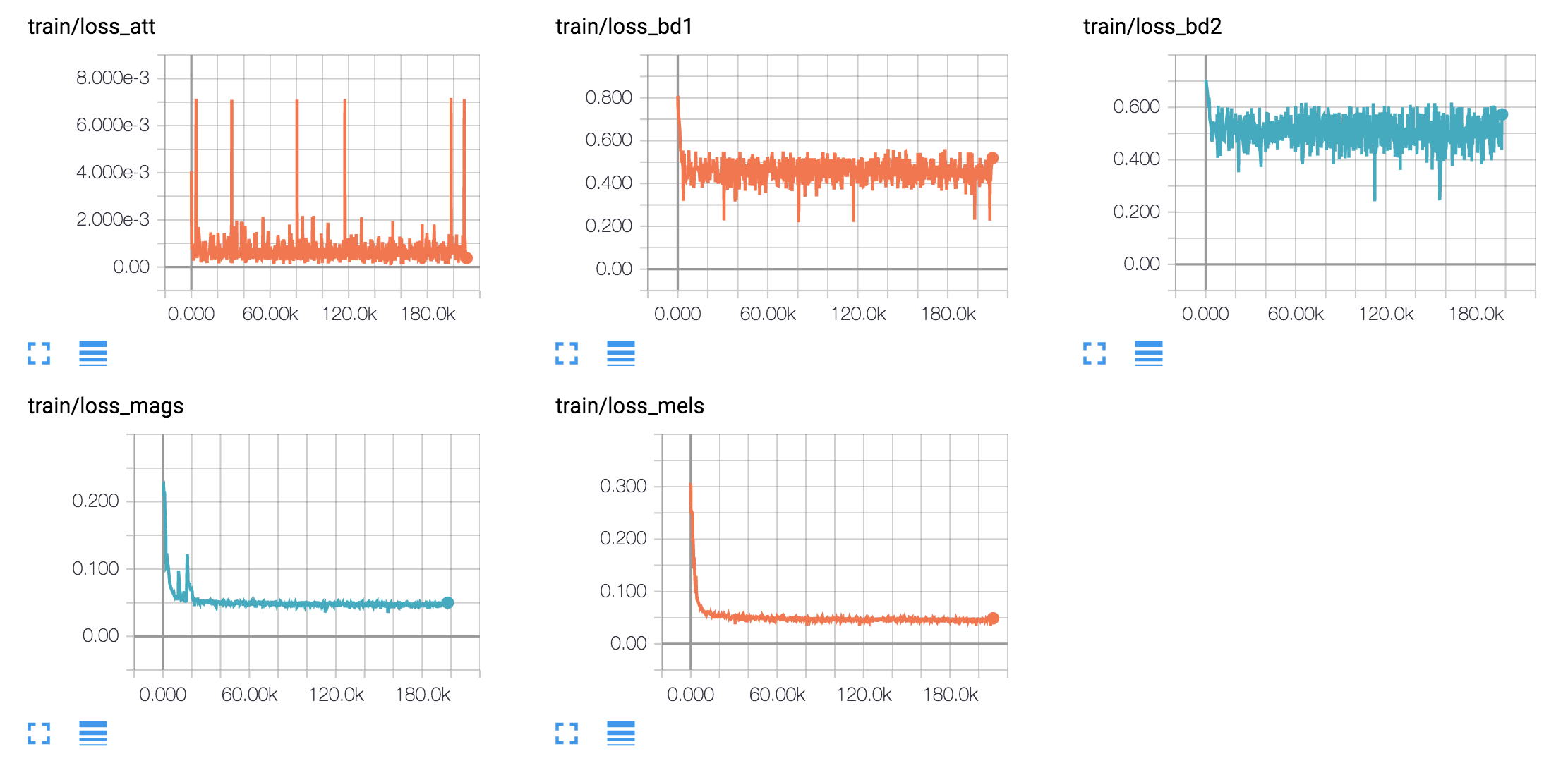 - 我曾尝试同时训练 Text2Mel 和 SSRN,但未能成功。我认为将这两个网络分开可以减轻训练负担。