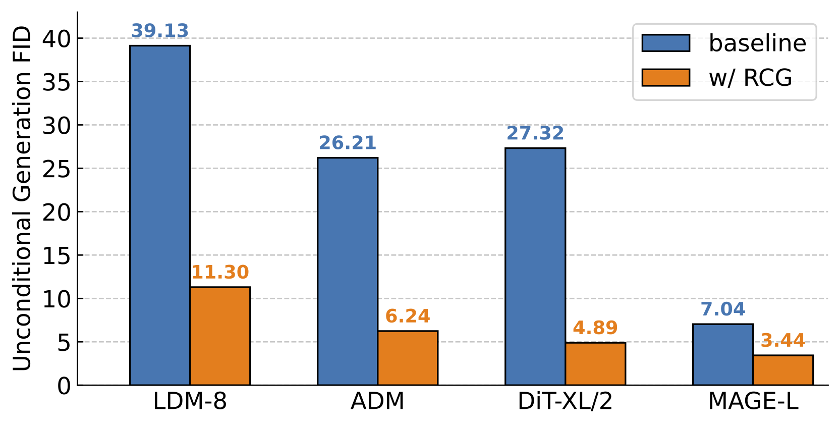 RCG 是一个自条件化的图像生成框架,在 ImageNet 256x256 数据集上实现了当前最优的无条件图像生成性能,从而弥合了长期以来无条件生成与类别条件生成之间的性能差距。