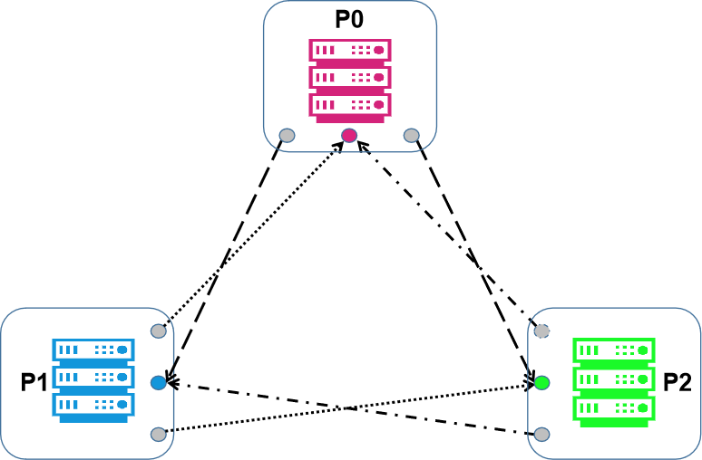 在这个示例中,我们假设三个人希望计算各自私有矩阵的乘积,但又不希望其他人知道他们持有的内容。为了简洁起见,我们将这三人分别称为 P0、P1 和 P2。