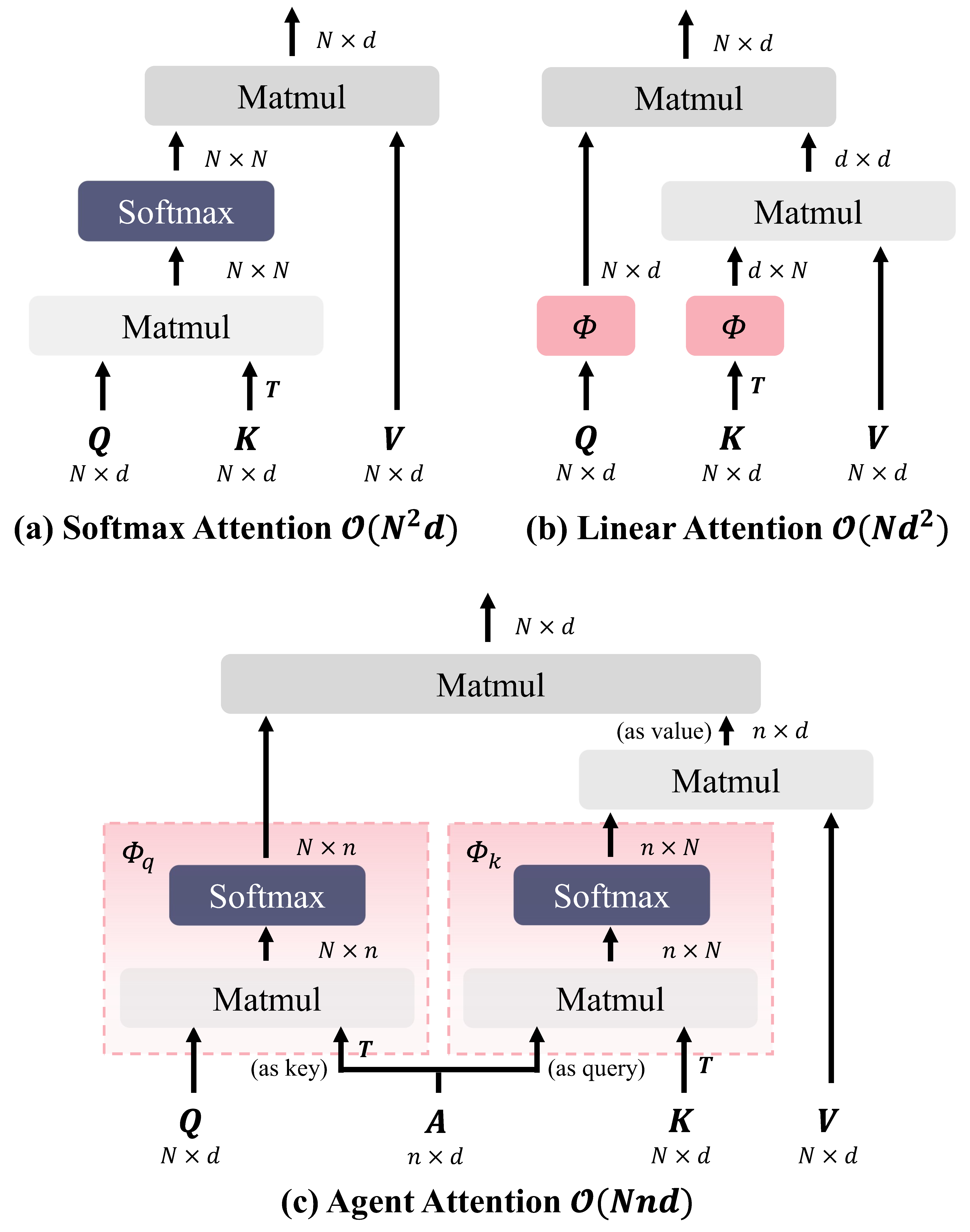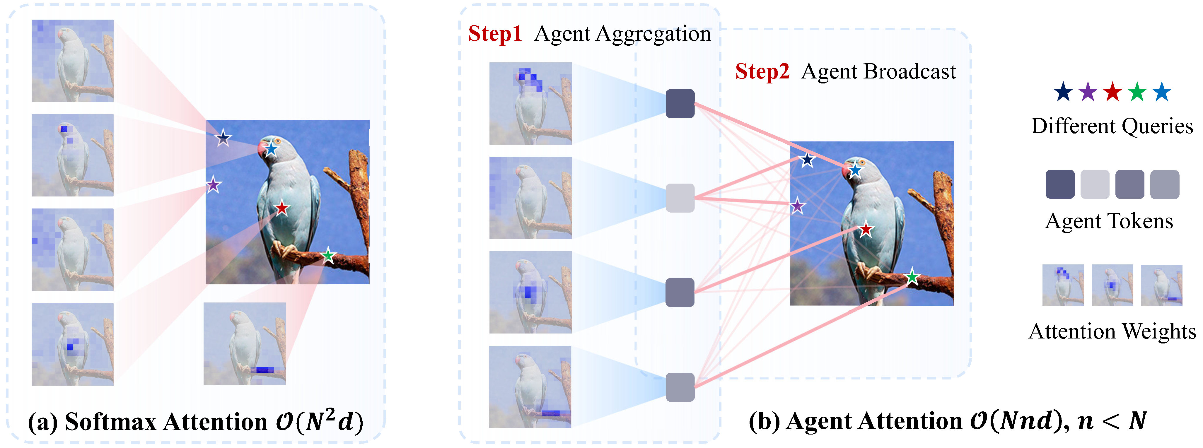 (a) 在 Softmax 注意力中,每个 query 都会从所有特征中聚合信息,导致复杂度呈二次方增长。(b) 利用注意力权重之间的冗余性,Agent Attention 使用少量的代理 token 作为 query 的“代理人”,从所有特征中捕捉多样化的语义信息,再将其传递给每个 query。