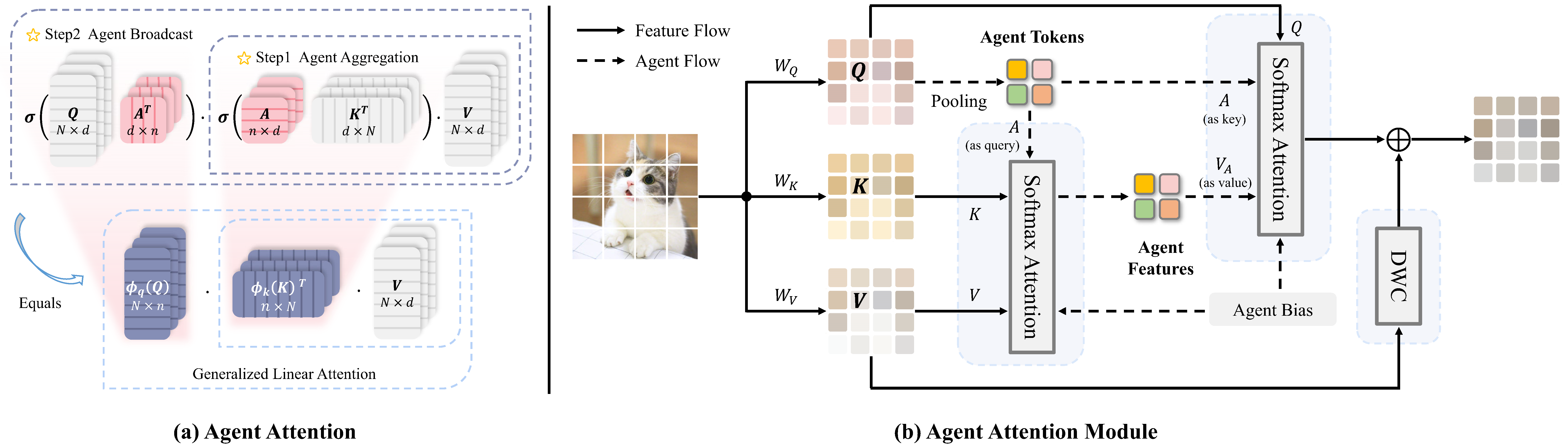 我们提出的 Agent Attention 及其模块示意图。 (a) Agent Attention 使用代理 token 聚合全局信息,并将其分发到各个图像 token,从而实现了 Softmax 注意力与线性注意力的实际融合。$\rm{\sigma}(\cdot)$ 表示 Softmax 函数。在 (b) 中,我们展示了 Agent Attention 模块的信息流。作为示例,我们通过池化操作获取代理 token。随后,代理 token 用于从 $V$ 中聚合信息,而 $Q$ 则从代理特征中查询信息。此外,还采用了代理偏置和 DWC 来加入位置信息并保持特征多样性。