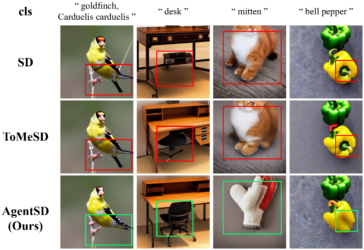 - Stable Diffusion、ToMeSD ($r=0.4$) 和 AgentSD ($r=0.4$) 生成的样本。