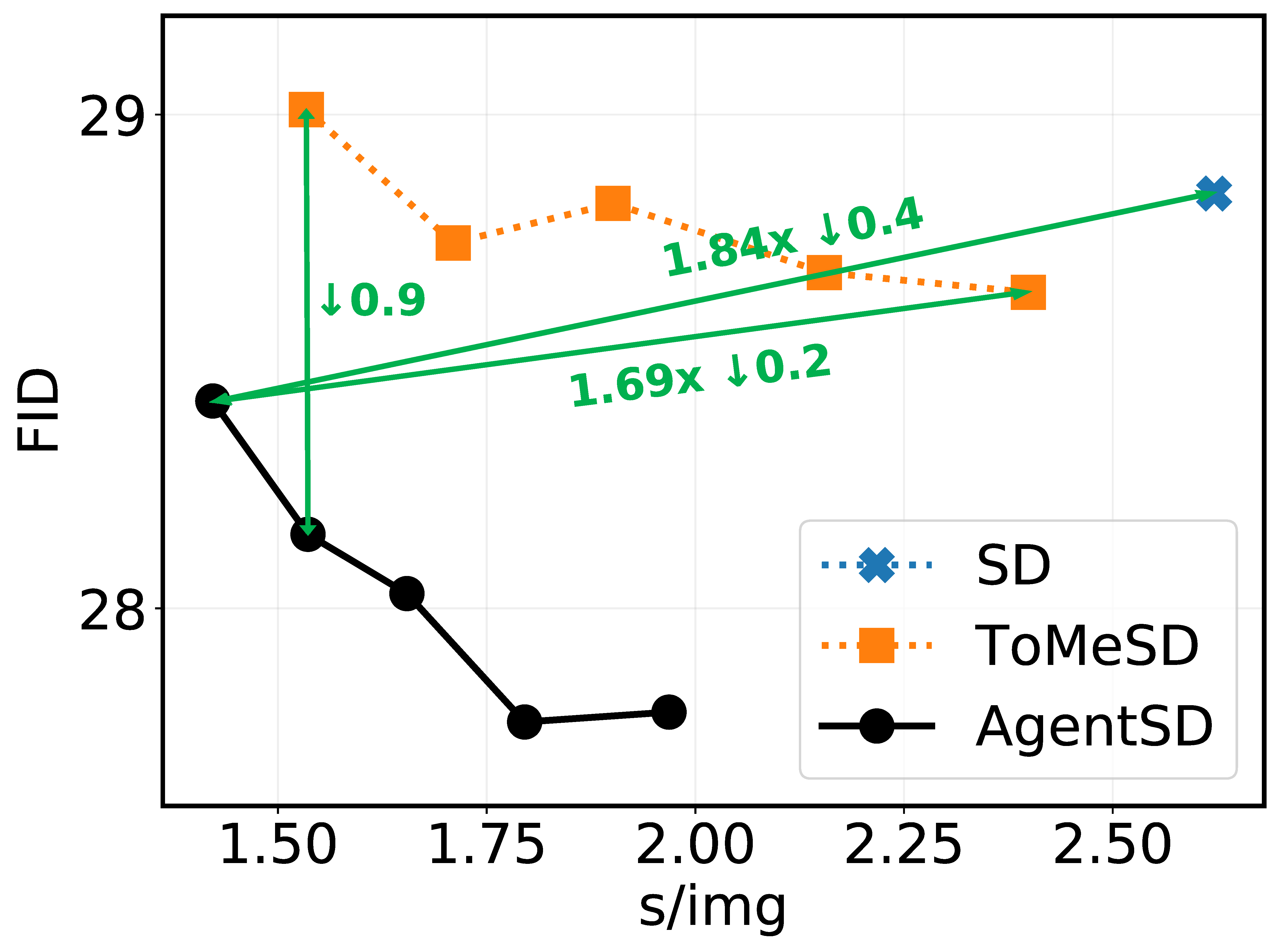 - Stable Diffusion、ToMeSD 和我们提出的 AgentSD 的定量结果。