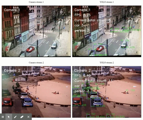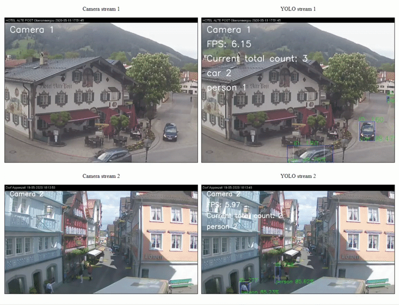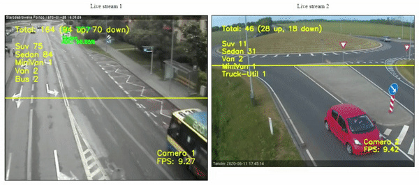 简单来说,我可以同时运行两条大约10fps的交通流量计数流(如交通流量计数gif所示)。当然,这很大程度上取决于视频流的分辨率以及用于检测和跟踪的帧数。