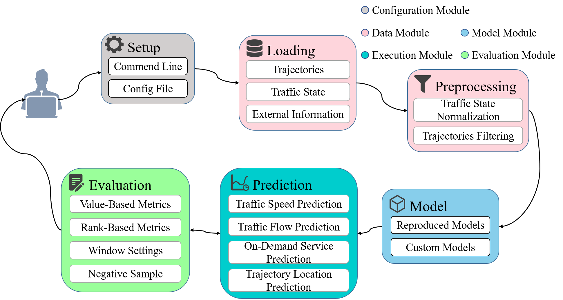 LibCity是一个统一、全面且可扩展的库,为交通预测领域的研究人员提供可靠的实验工具和便捷的开发框架。我们的库基于PyTorch实现,将与交通预测相关的所有必要步骤或组件整合进一个系统化的流程中,使研究人员能够开展全面的实验。LibCity将有助于推动交通预测领域的标准化和可重复性研究。