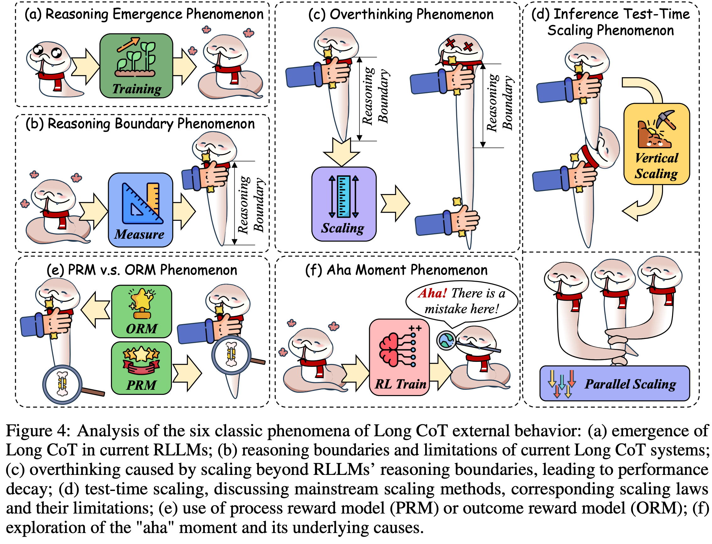 - 然后,我们研究了具有这些特征的Long CoT的出现等关键现象,包括过度思考和测试时缩放,从而揭示这些过程在实践中的表现方式。