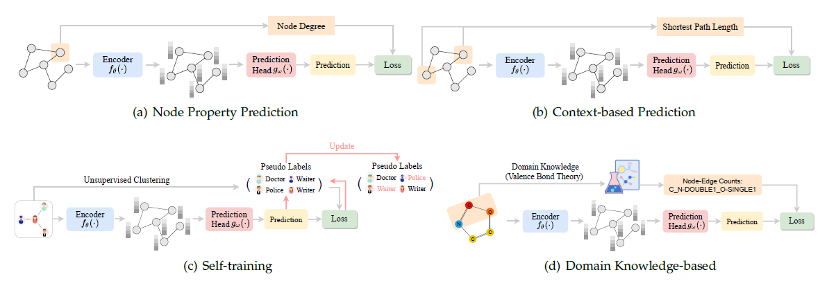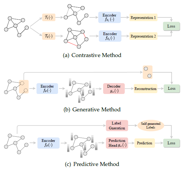- 预测式学习:一般通过简单的统计分析或专家知识从图数据中自动生成标签,并基于这些自动生成的标签设计预测型前置任务来处理数据与标签的关系。