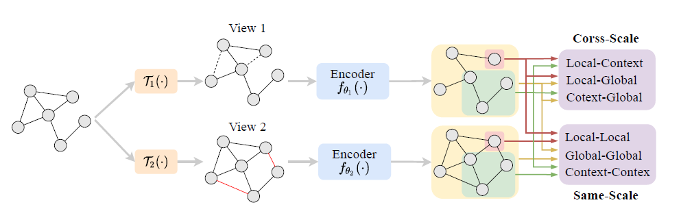 对比学习的一般框架如下所示。两个对比组件可以是局部的、上下文相关的或全局的,分别对应于图中的节点级(红色标记)、子图级(绿色标记)或图级(黄色标记)信息。因此,对比学习可以对比两个视图(在同一尺度或不同尺度上),从而产生两类算法:(1) 同尺度对比,包括 局部-局部(L-L) 对比、上下文-上下文(C-C) 对比和 全局-全局(G-G) 对比;以及 (2) 跨尺度对比,包括 局部-上下文(L-C) 对比、局部-全局(L-G) 对比和 上下文-全局(C-G) 对比。