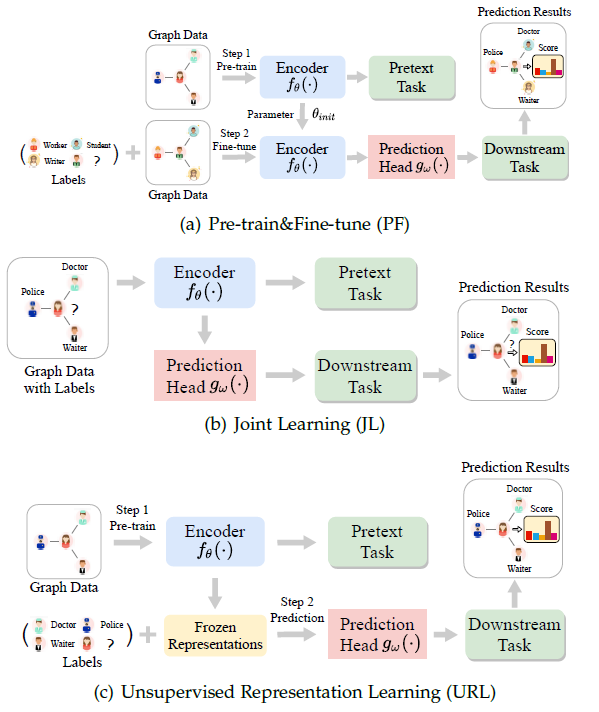 - 无监督表征学习(URL):首先使用自监督前置任务对编码器进行无标签节点的预训练。随后冻结预训练好的编码器参数,并将其用于带有额外标签的有监督下游任务中。