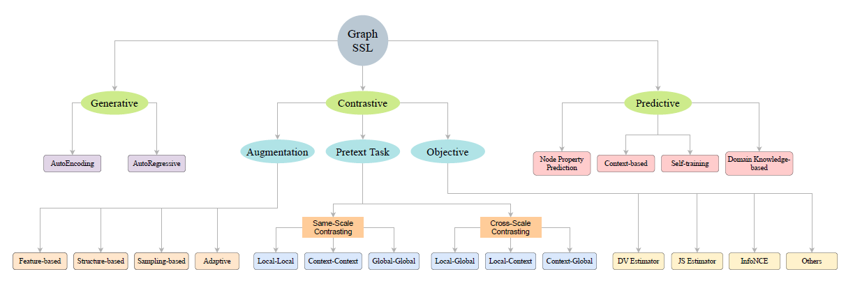 我们将最初在计算机视觉和自然语言处理领域兴起的自监督学习概念扩展到图数据领域,以及时且全面地回顾现有的图自监督学习技术。具体而言,我们根据下图所示,将现有的图自监督学习方法分为三类:对比学习、生成式学习和预测式学习。