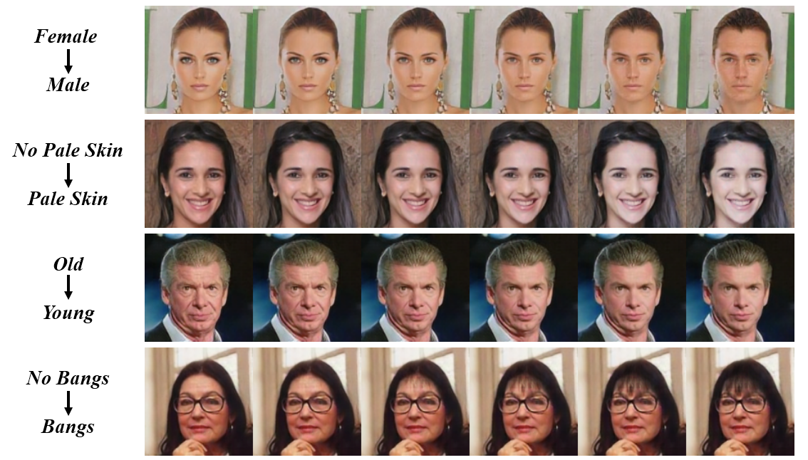 - 可通过指定属性标签(如 Young=0, Mustache=1)精确编辑目标特征,其余面部区域几乎无扰动,保持角色一致性。