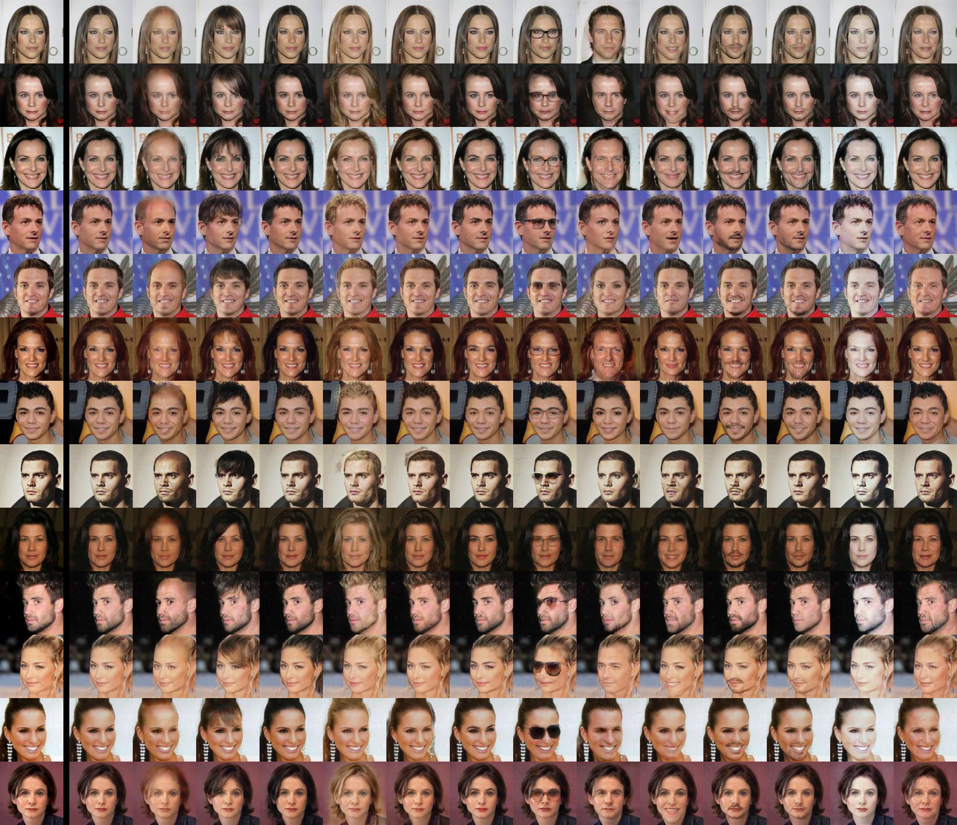 从左到右依次为:输入图像、重建图像、秃头(Bald)、刘海(Bangs)、黑发(Black_Hair)、金发(Blond_Hair)、棕发(Brown_Hair)、浓眉(Bushy_Eyebrows)、眼镜(Eyeglasses)、男性(Male)、微张嘴(Mouth_Slightly_Open)、胡子(Mustache)、无胡须(No_Beard)、苍白皮肤(Pale_Skin)、年轻(Young)