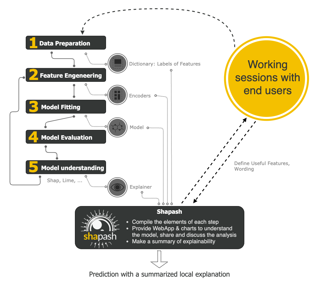 Shapash 是一个用于模型可解释性相关库的叠加型工具包。它使用 Shap 或 Lime 作为后端来计算特征贡献。 Shapash 基于构建机器学习模型所需的各个步骤,使结果更加易于理解。