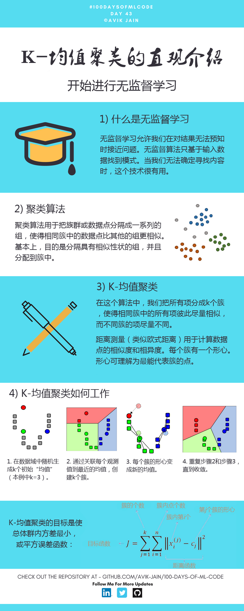 转到无监督学习,并研究了聚类。可在作者网站查询。发现一个奇妙的动画有助于理解K-均值聚类。