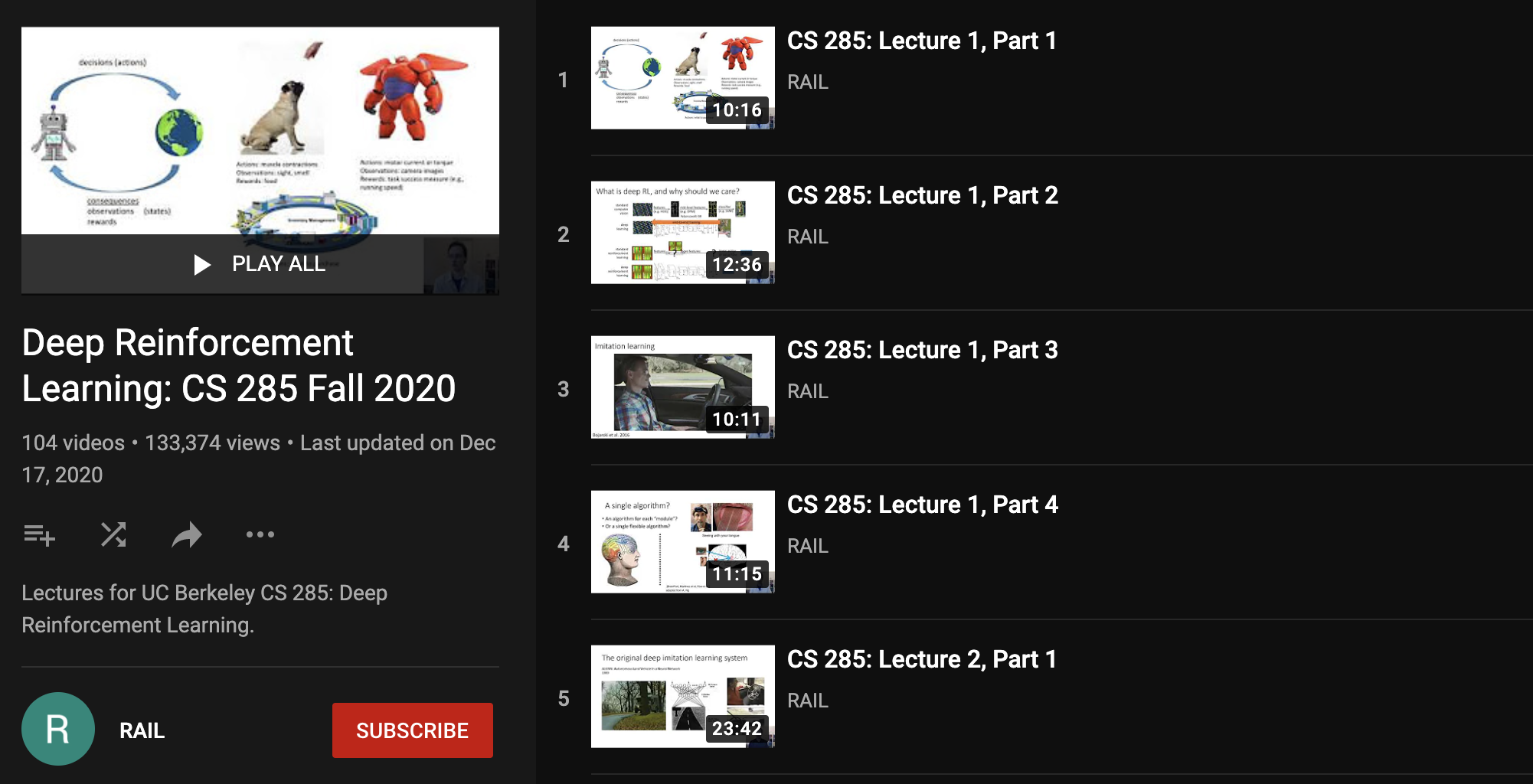 - 加州大学伯克利分校CS285:深度强化学习,2020年秋季