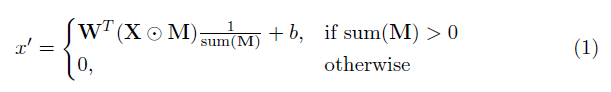 本实现中的关键组件是部分卷积层。基本原理是:给定卷积滤波器 W 和对应的偏置 b,与普通卷积不同,这里应用的是部分卷积: