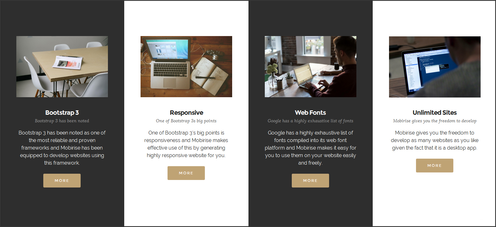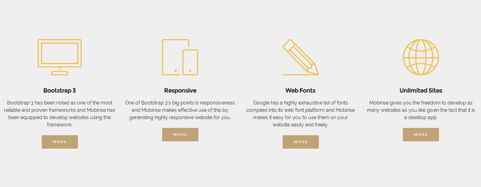 Bootstrap 3 被公认为最可靠、经过验证的框架之一,而 Mobirise 已具备使用该框架开发网站的能力。