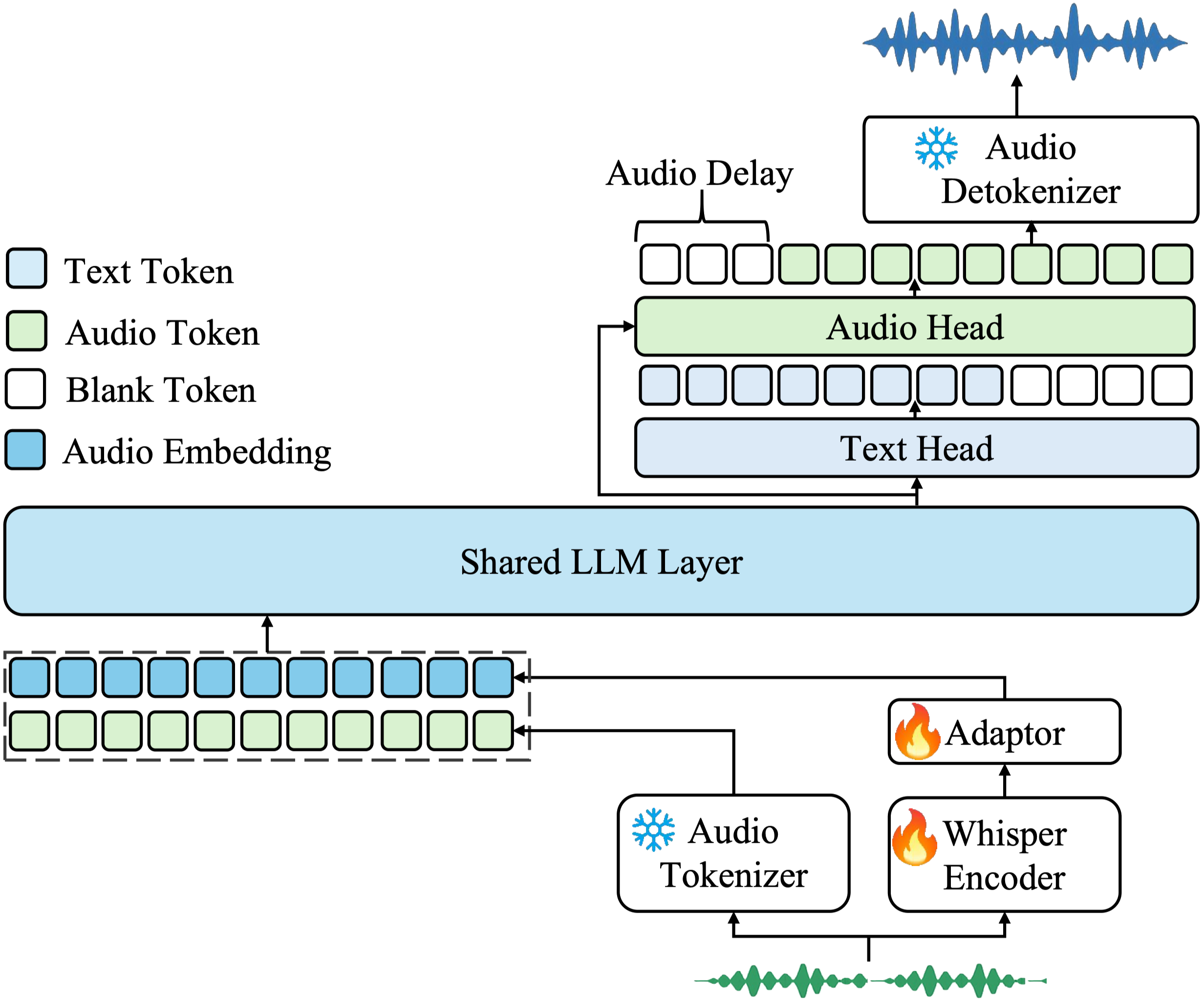 - 新颖架构: 采用混合音频输入(连续声学向量 + 离散语义标记)以及一个带有并行头用于生成文本和音频标记的 LLM 核心。