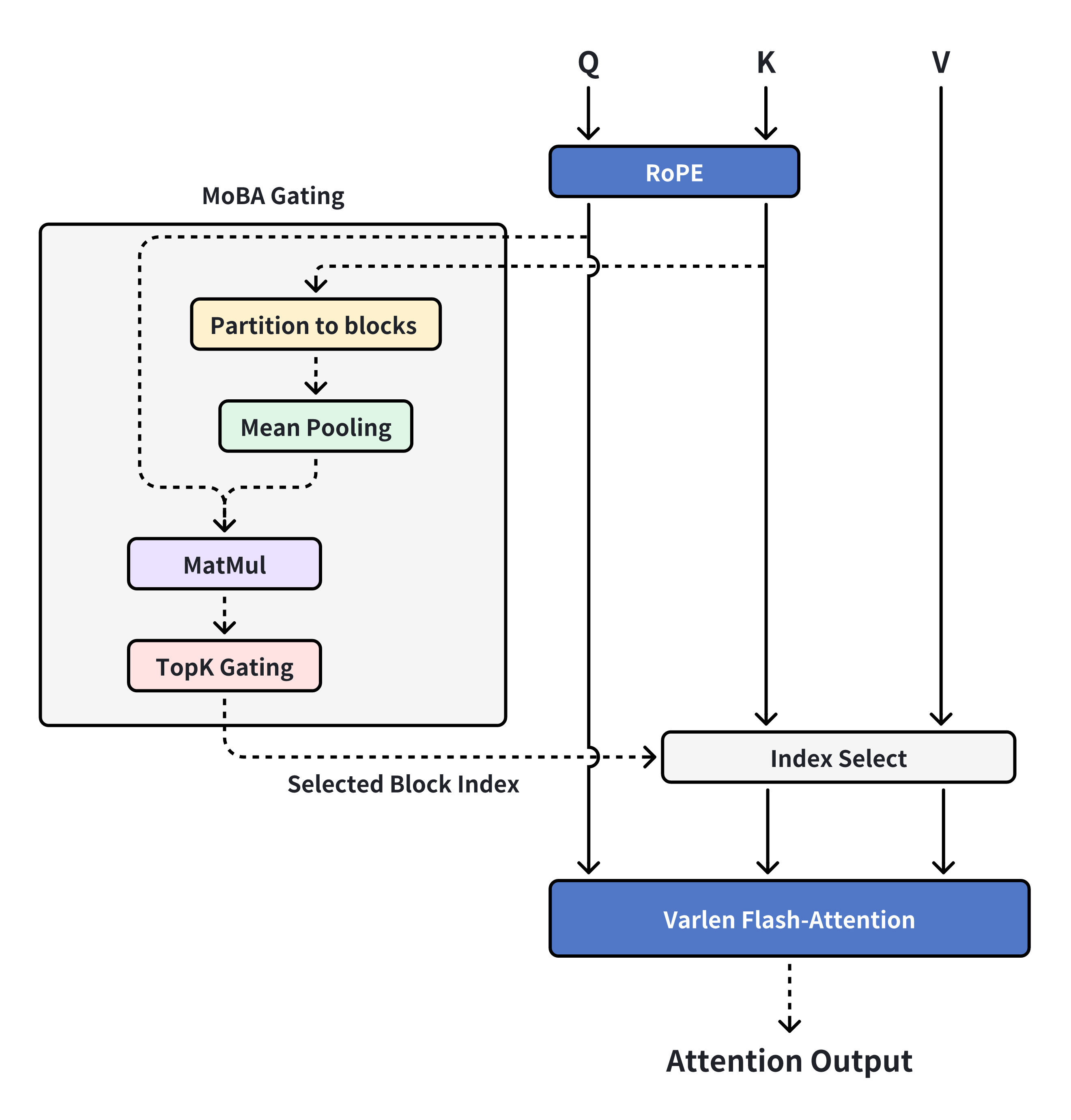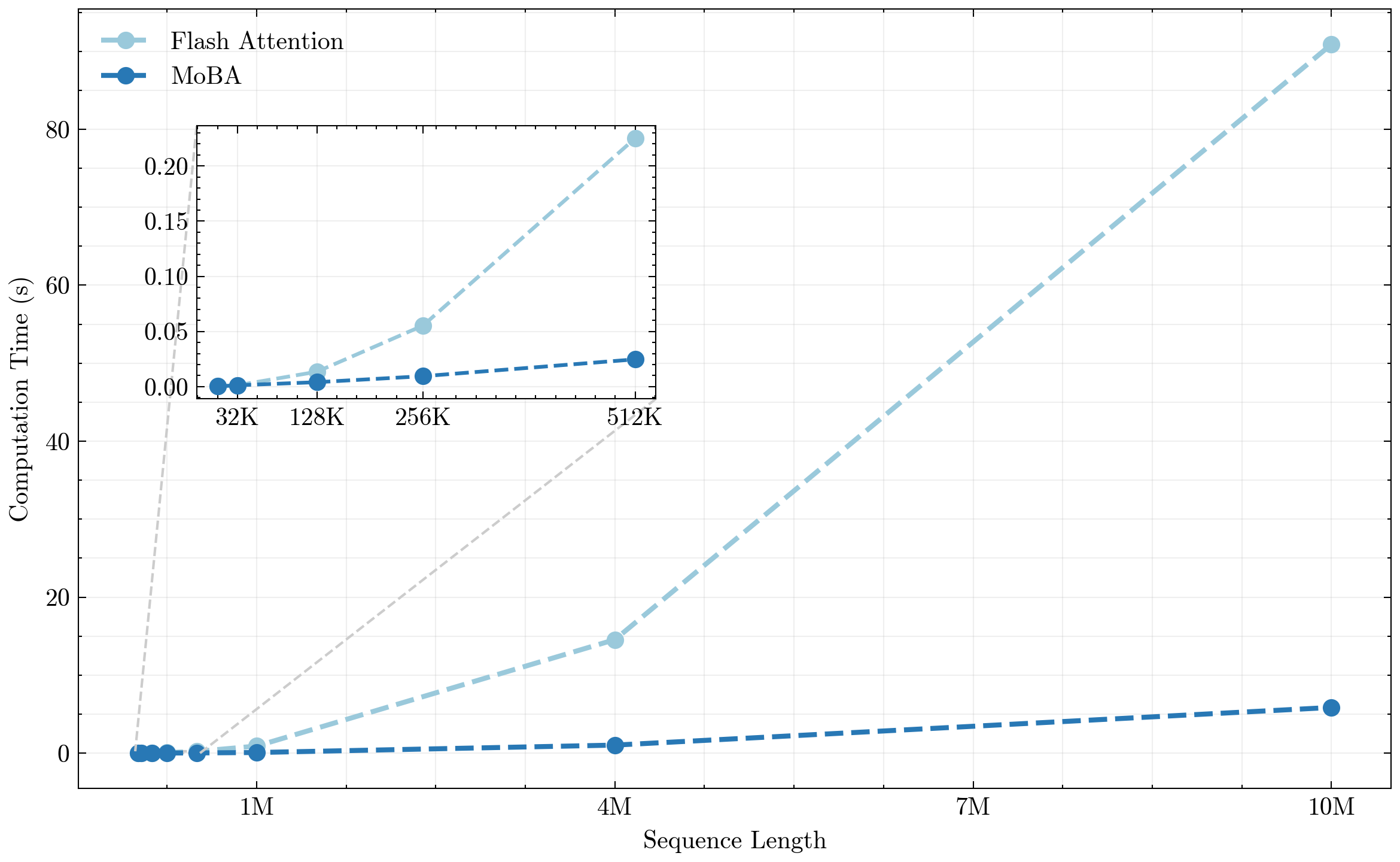 - 推理速度飞跃:MoBA 将全文分块并让模型自主筛选关键块,在百万级上下文下实现数十倍加速,响应缩短至秒级。
