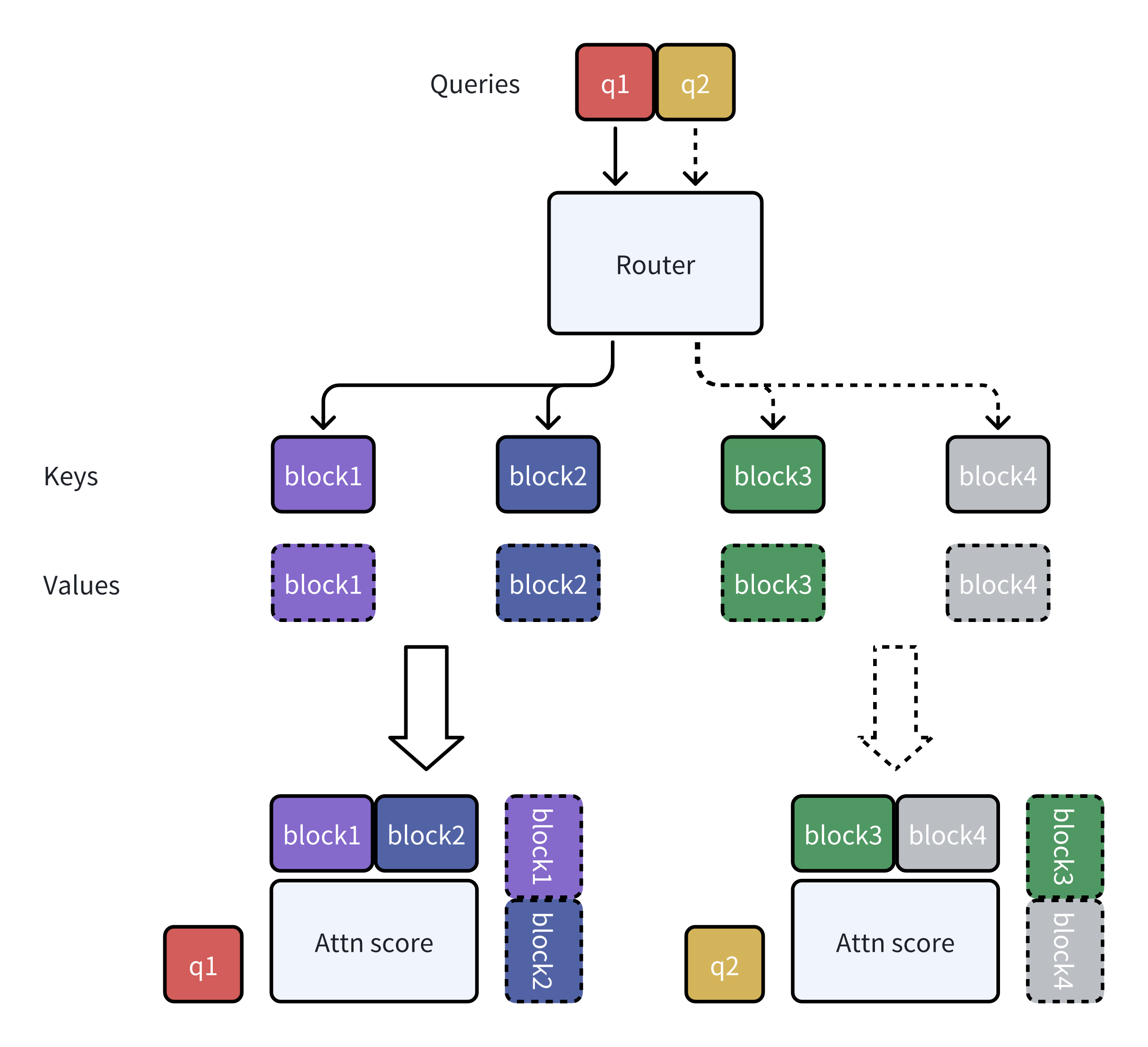 - 可训练的块稀疏注意力:将完整上下文划分为多个块,每个查询 token 自主学习关注最相关的 KV 块,从而高效处理长序列。