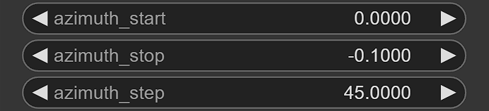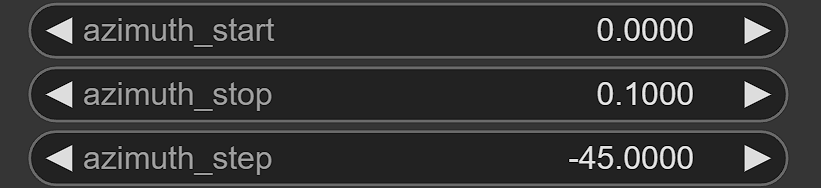 - 方位角:在俯视图中,从角度0开始以-90度为步长旋转360度,得到(0, -90, -180/180, 90, 0),此时相机顺时针旋转,反之亦然。