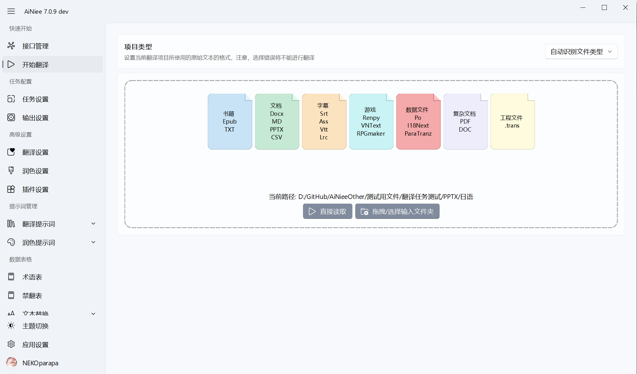 - 输入文件夹:将原文文件单独放置新的文件夹,并将该文件夹拖入框内。小说、字幕、文档可直接进行翻译,游戏需要文本提取工具进行配合。