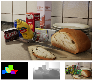 使用 NDDS 生成的一张示例图像,附带真值分割、深度和物体位姿标注。