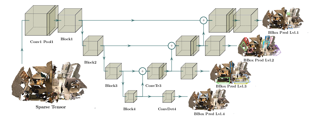 然而,在这项工作中,我们专注于 空间上 稀疏的数据,特别是高维的空间稀疏输入、3D 数据以及 3D 对象表面上的卷积,这一概念最早由 Siggraph'17 提出。我们也可以将这些数据表示为稀疏张量,而这类稀疏张量在 3D 感知、配准和统计数据分析等高维问题中非常常见。我们将专为这类输入设计的神经网络称为 稀疏张量网络,这些稀疏张量网络以稀疏张量作为输入和输出进行处理和生成。为了构建稀疏张量网络,我们可以像定义稠密张量上的网络层一样,使用 MLP、非线性变换、卷积、归一化、池化等标准神经网络层,并将其在 Minkowski Engine 中实现。