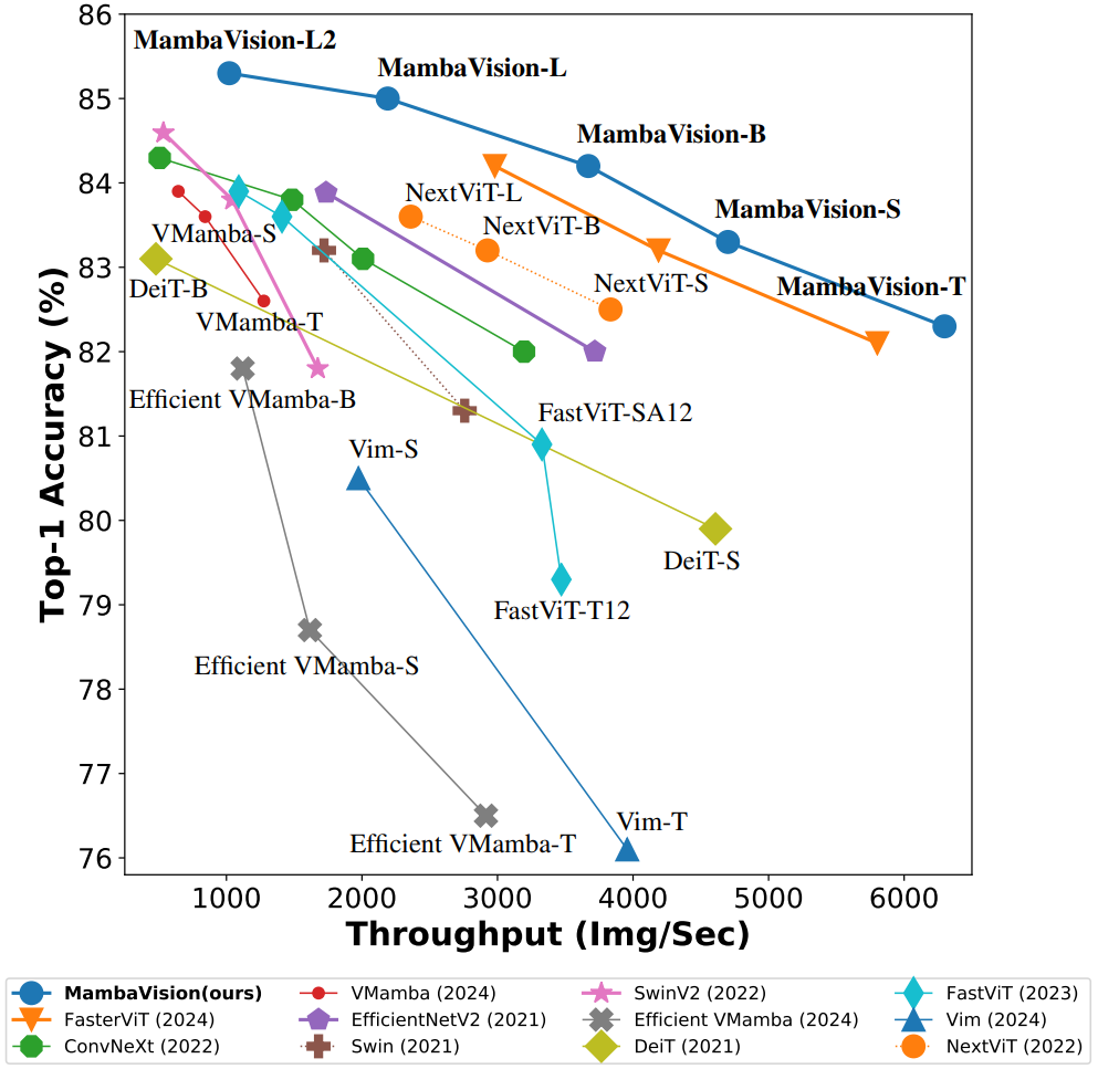 - 突破性能帕累托前沿:MambaVision 在 Top-1 准确率和吞吐量上同时达到新的高度,让团队无需再牺牲精度来换取速度,大幅提升了系统安全性。