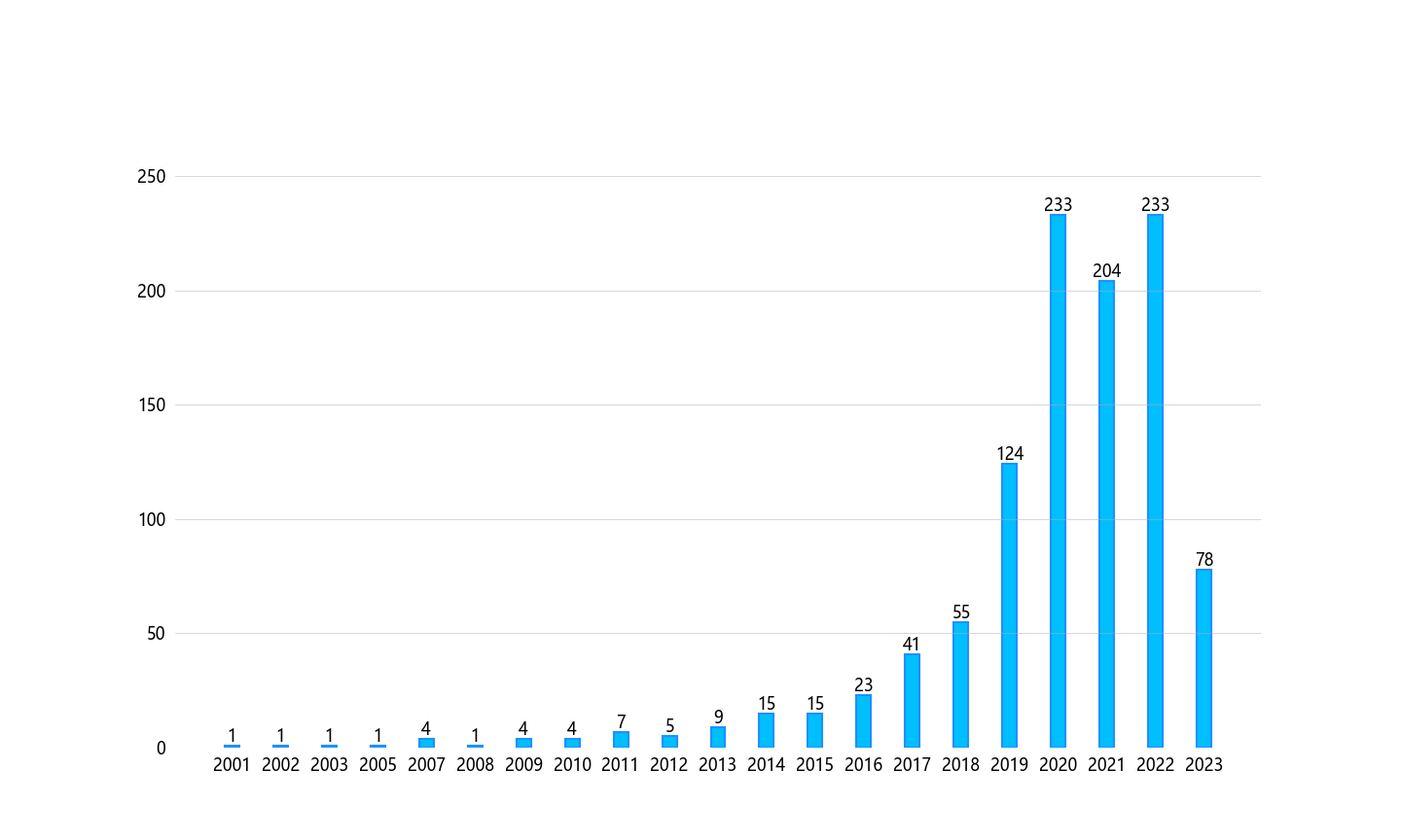 此外,我们还绘制了论文数量随发表年份变化的曲线图(见图3)。